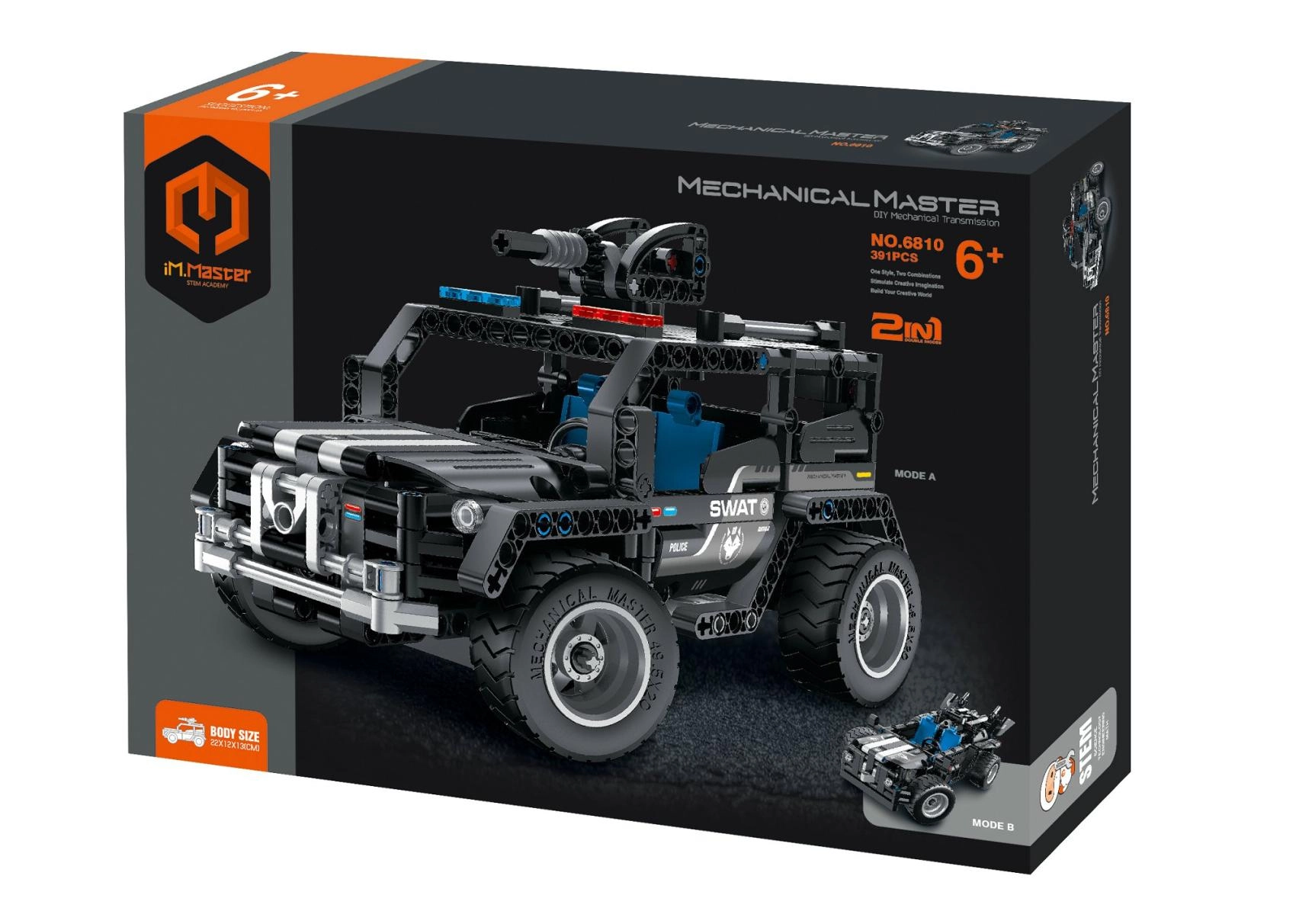 Construisez votre propre robuste véhicule tout-terrain avec le kit iM.MASTER. Ce modèle 2‑en‑1 permet d’assembler deux variantes différentes de 4x4 à partir de 391 pièces et offre des détails réalistes ainsi que des éléments mobiles. Excellente jouet STEM pour développer la créativité, la pensée technique et la motricité fine des enfants dès 6 ans.