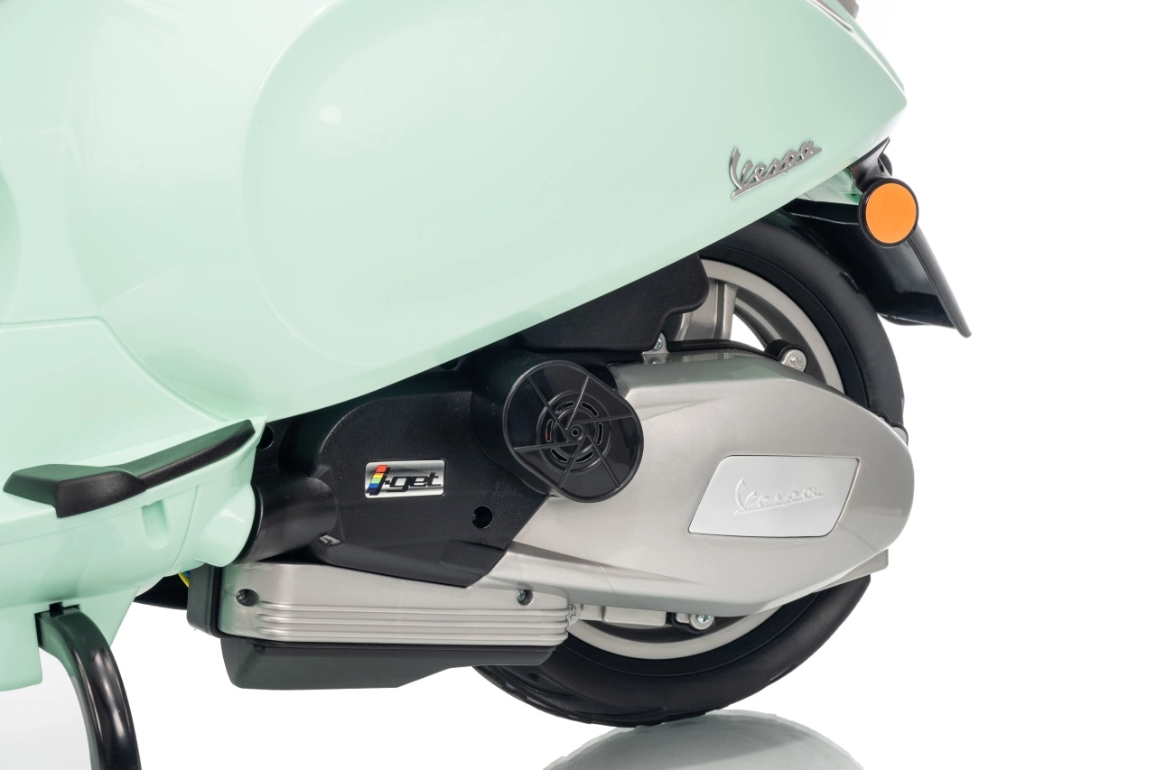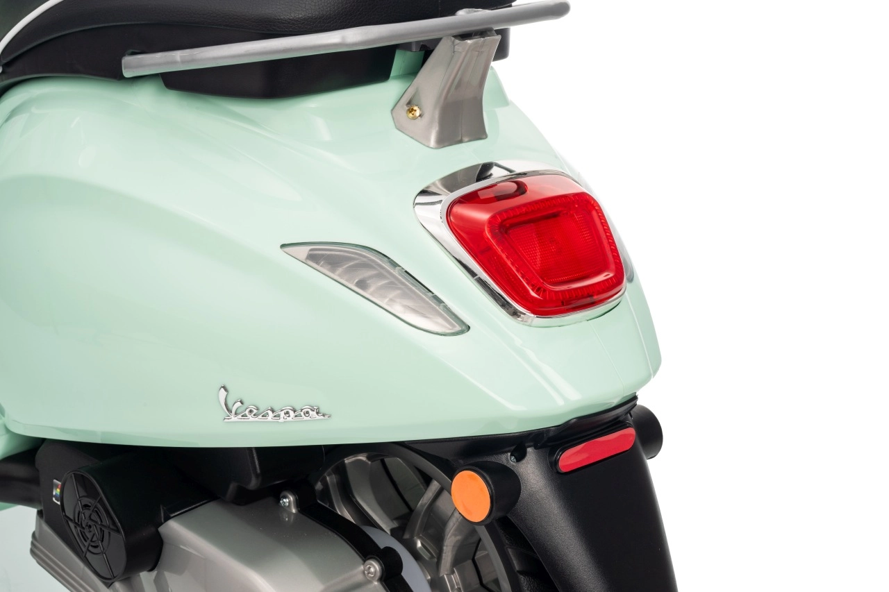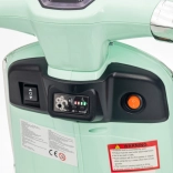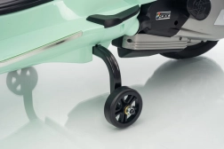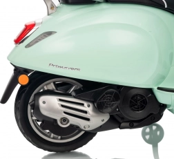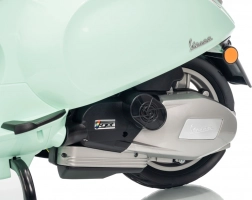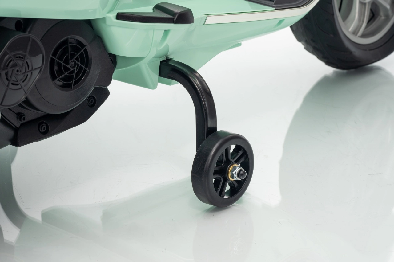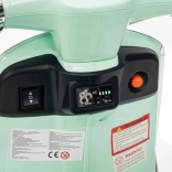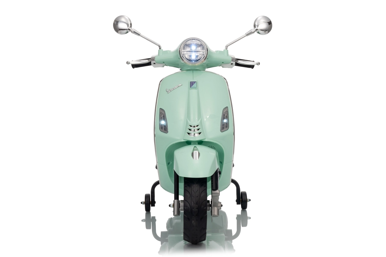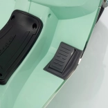 La trottinette électrique pour enfants au style élégant VESPA Roma en vert menthe séduit par son design réaliste, ses deux moteurs 2×35 W, sa batterie 12 V 7 Ah puissante et ses roulettes de stabilisation pour une conduite en toute sécurité. Le confort est assuré par une selle en cuir éco, des roues EVA silencieuses et des feux LED avant et arrière. Elle dispose aussi du Bluetooth/MP3/AUX, d’effets sonores et d’un klaxon au guidon, ainsi que d’un indicateur de charge.