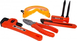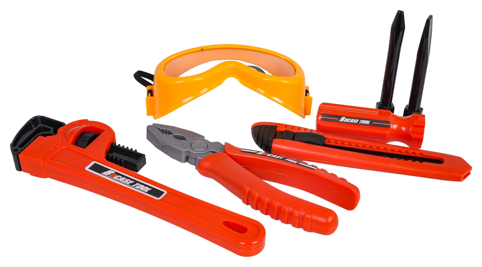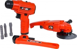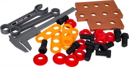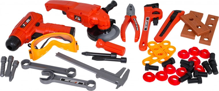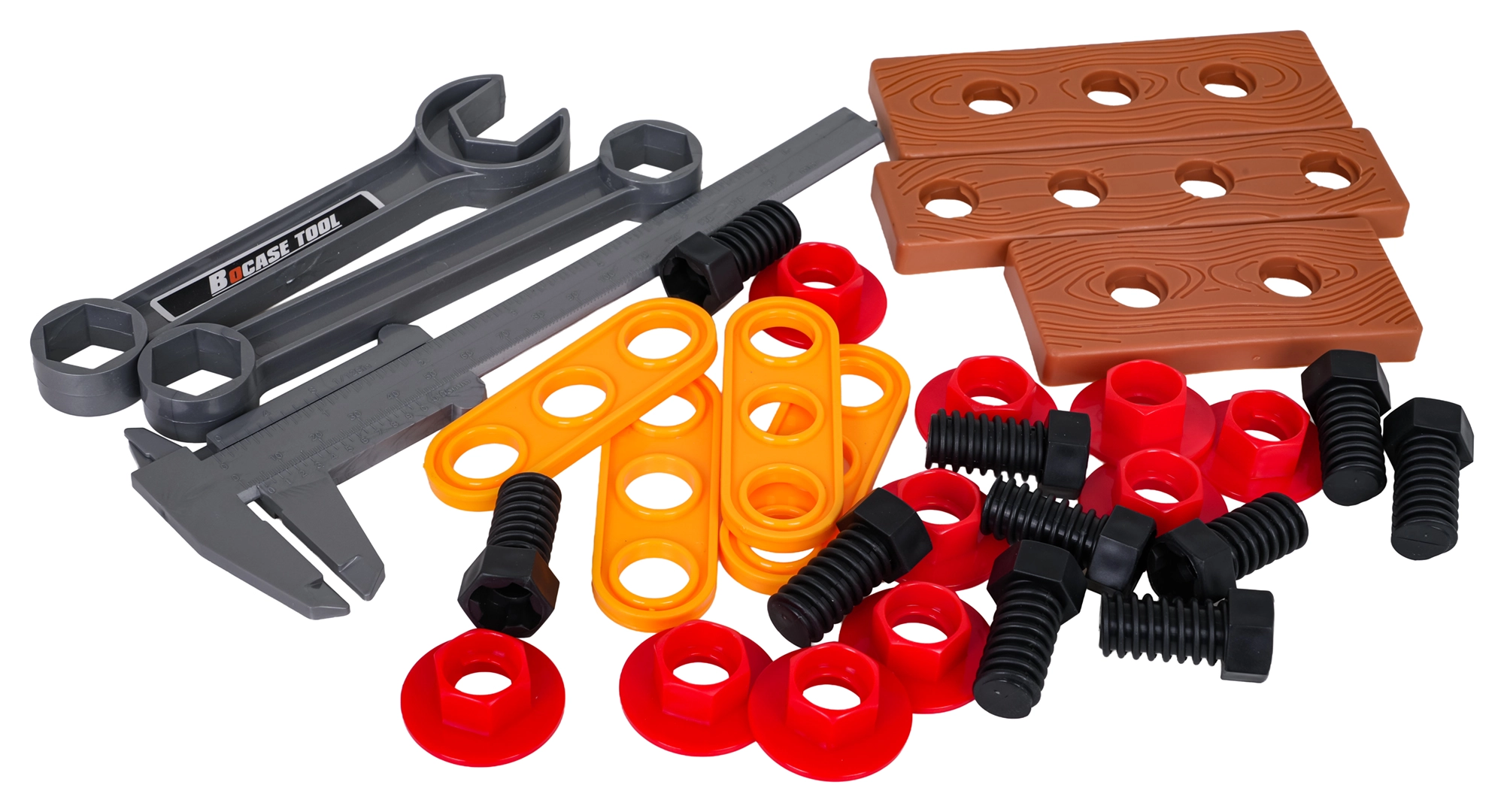 Le set comprend également une meuleuse d’angle à disque manuel, des jeux de clés, une pince, un couteau, un tournevis avec embouts, un pied à coulisse et des lunettes de protection. Les enfants peuvent entraîner leur motricité fine, leur logique et leur imagination en assemblant les pièces à l’aide de vis et d’écrous.