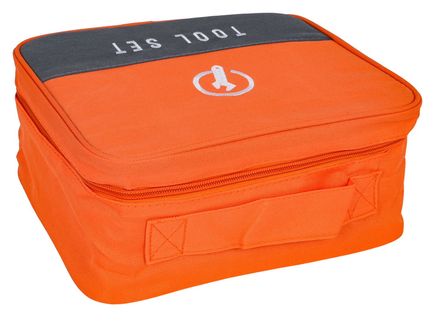 Le sac textile résistant avec fermeture éclair et poignée renforcée garde les outils bien rangés. Idéal pour le stockage et le transport de l’ensemble.