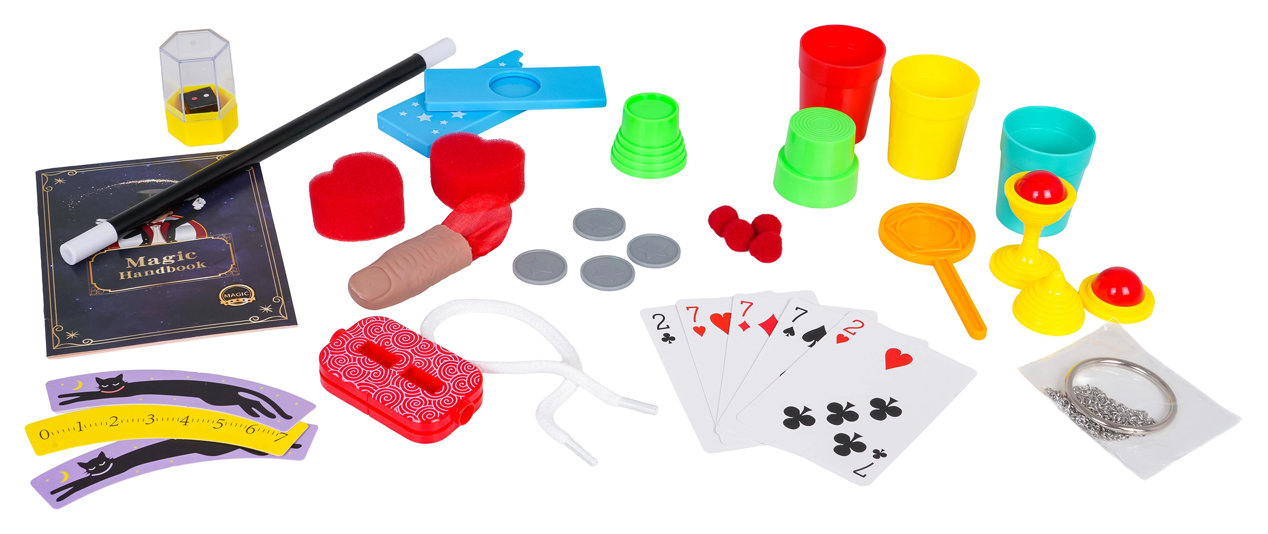 Le coffret contient une variété de accessoires de magie – de la baguette magique, gobelets et pièces jusqu’aux accessoires spéciaux pour capter l’attention du public. Chaque tour est clairement expliqué et adapté aux enfants, afin qu’ils puissent profiter de la réussite et renforcer leur confiance en soi.