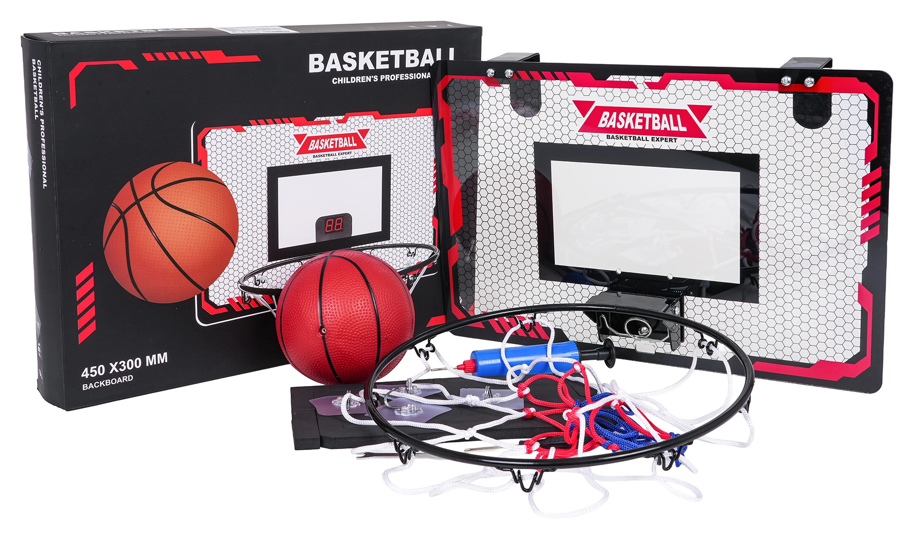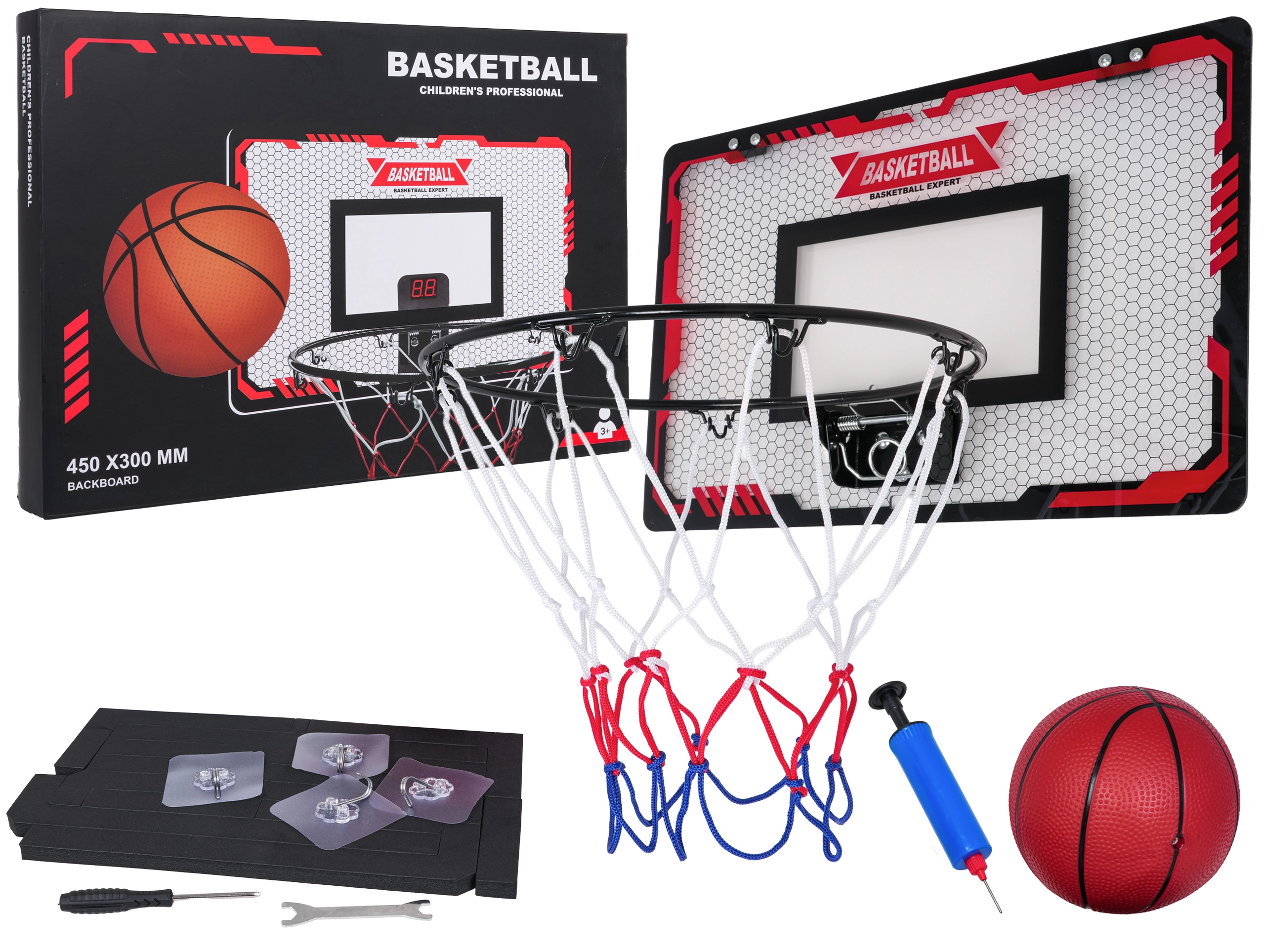 Le set comprend tout pour jouer immédiatement : panneau en plastique robuste, anneau métallique avec filet, ballon en caoutchouc, pompe avec aiguille et un kit de montage complet incluant tournevis et clé. Idéal pour la chambre d’enfant, le couloir ou la salle de jeux – favorise la coordination œil-main, la précision et l’esprit de compétition.