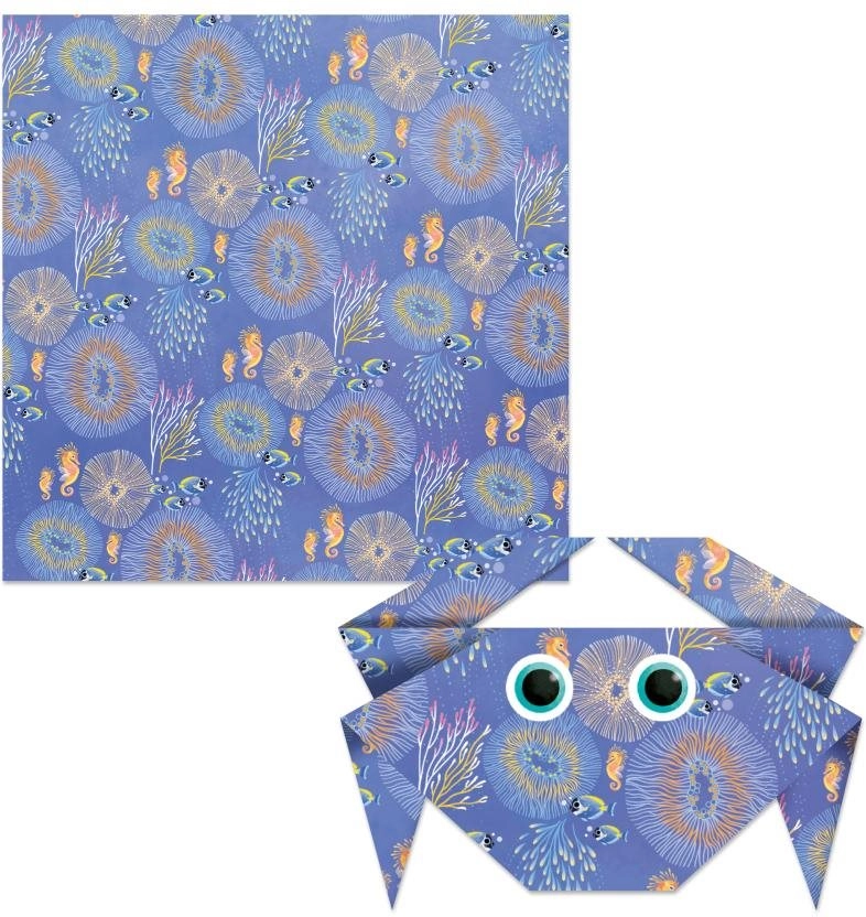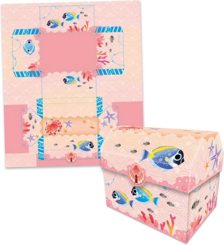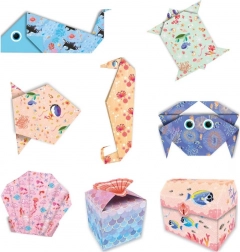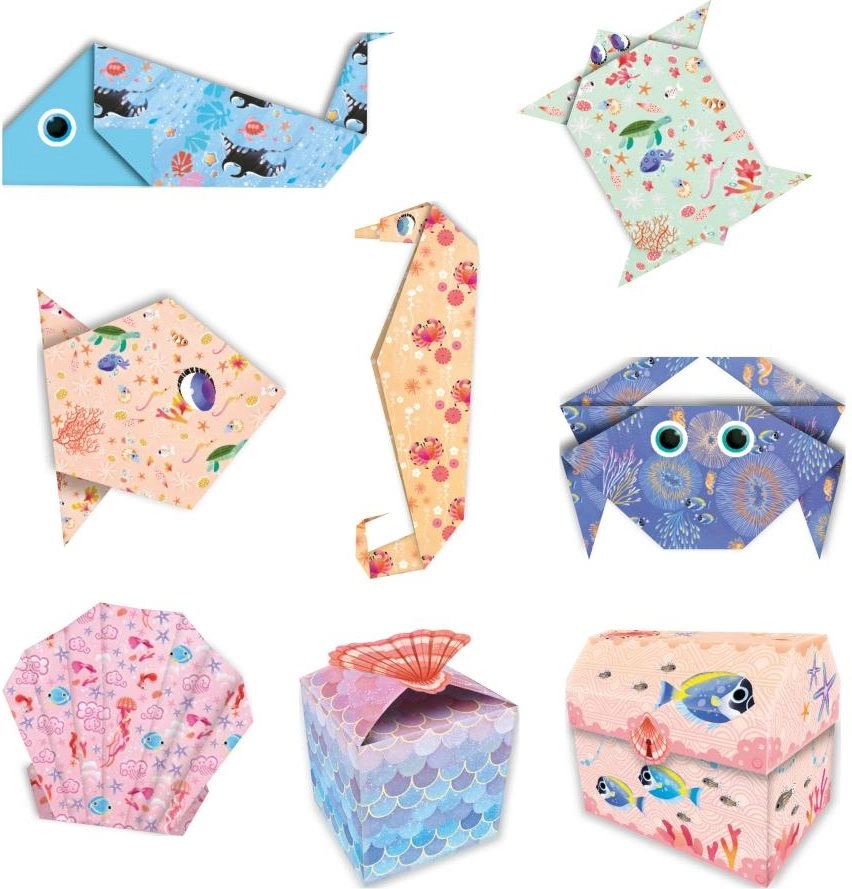 À partir des papiers préimprimés, pliez facilement des poissons, une tortue, un crabe, un hippocampe ainsi que de petites boîtes et coffrets à trésors.