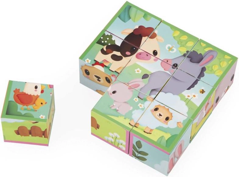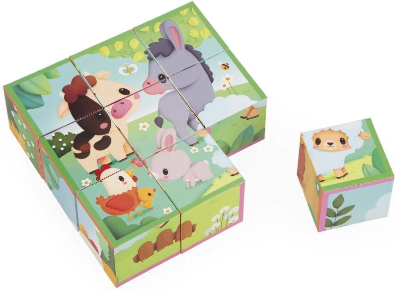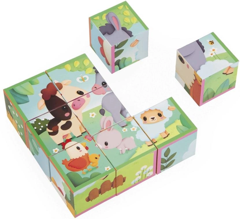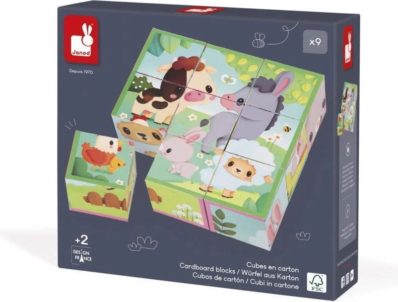 Ce classique jeu de cubes illustrés sur le thème de la ferme apporte aux enfants la joie de découvrir et d’apprendre. Avec 9 cubes en bois de haute qualité, composez facilement 6 images différentes avec des animaux. En jouant, les enfants s’exercent à assembler, trier et s’orienter dans l’espace.