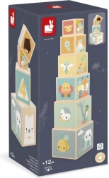 Six cubes de tailles différentes peuvent être empilés en hauteur ou emboîtés les uns dans les autres selon leur taille. Les enfants entraînent ainsi l’équilibre, la logique et la patience.