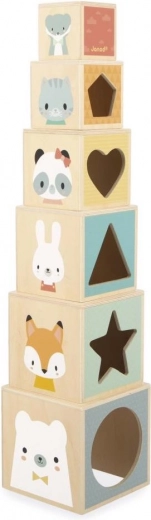 Cette pyramide en bois composée de 6 cubes séduit par ses couleurs douces et ses illustrations pleines de tendresse. Les enfants peuvent empiler, trier et combiner les cubes, ce qui leur permet de mieux comprendre les principes d’équilibre, de taille et d’espace. Chaque cube possède 5 faces différentes : un animal mignon, un animal dans son environnement, un petit animal sur fond coloré, un chiffre pour les premiers calculs et une forme découpée qui, en assemblant deux cubes, révèle une image joyeuse (par exemple un chaton dans un cœur).