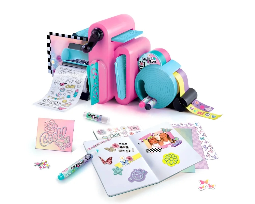 Le coffret contient une station décorative, un carnet, des papiers colorés et à motifs, des feuilles métalliques, des rubans décoratifs, des autocollants, des pochoirs pour embossage et pour décalquer, des feutres, de la colle et plus encore. Les enfants peuvent ainsi facilement réaliser des cartes, collages, cartes de vœux, pages de scrapbooking ou accessoires personnalisés.