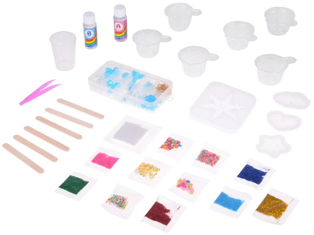 Ce kit créatif vous permet de mouler facilement des ornements en résine d’une transparence cristalline dans des formes populaires – étoile, nuage ou cœur. Mélangez les composants A et B à raison de 1:1, ajoutez des paillettes ou des confettis colorés, versez dans les moules en silicone et, après polymérisation, complétez avec des anneaux métalliques, chaînes et perles. Grâce à l’organiseur pratique, vous gardez tous les éléments bien ordonnés à portée de main.