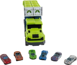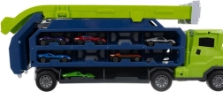 - Camion avec remorque et rampe double, 6 petites voitures en métal, set d’autocollants, manuel, emballage cadeau coloré, carton de transport