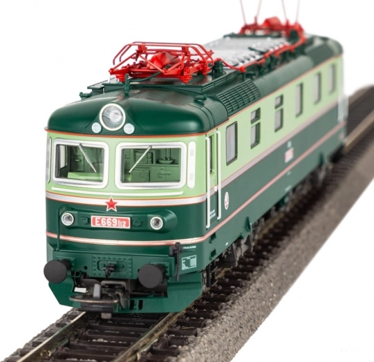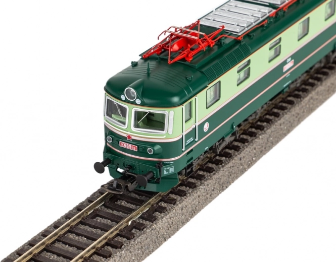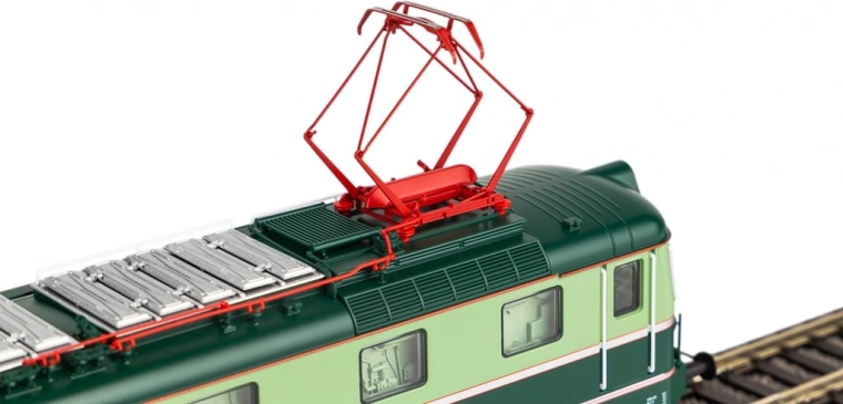 Deux pantographes à ciseaux en métal, tampons ronds et équipement de toiture et de caisse richement détaillés assurent l’authenticité de la locomotive ČSD.