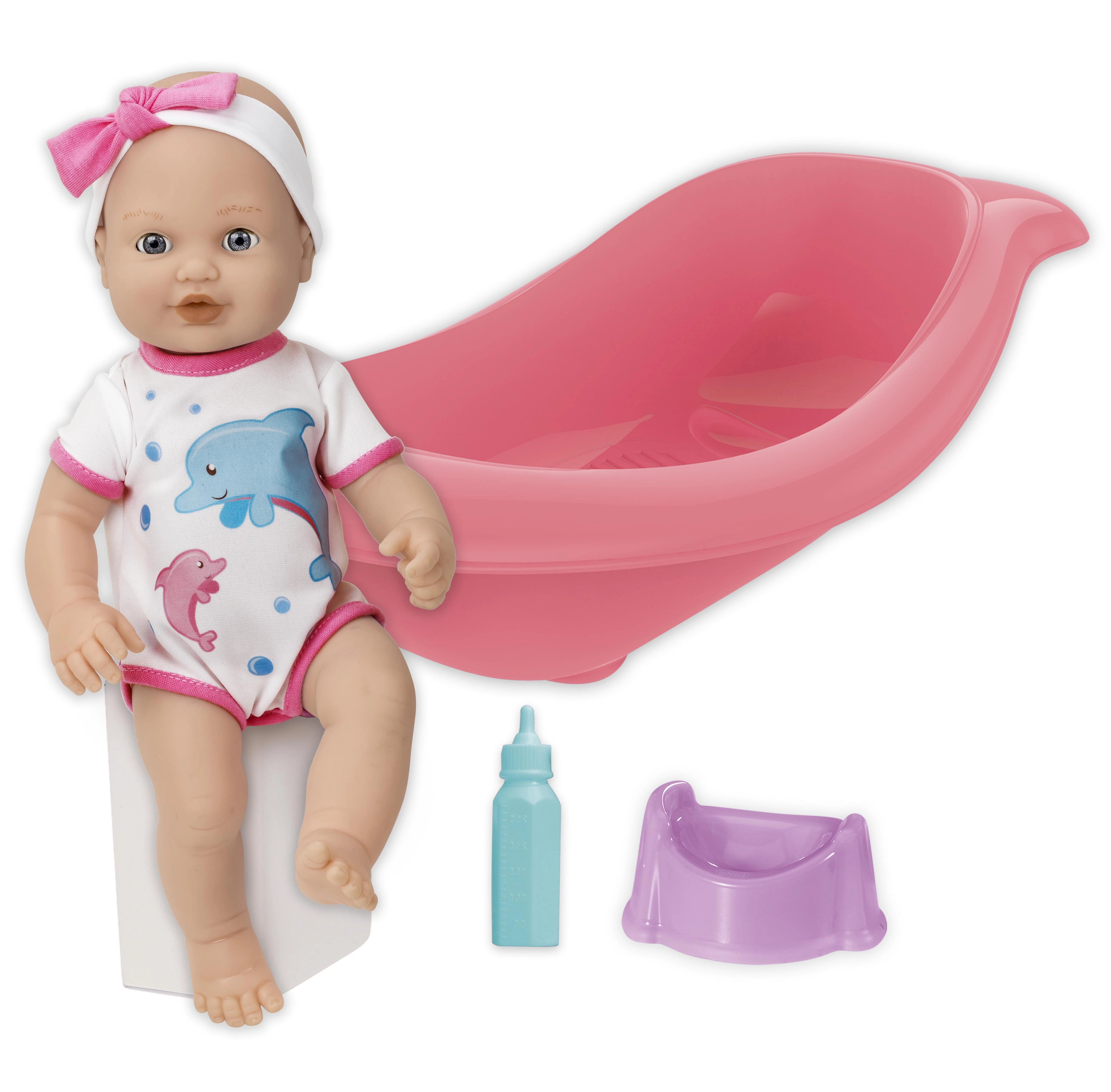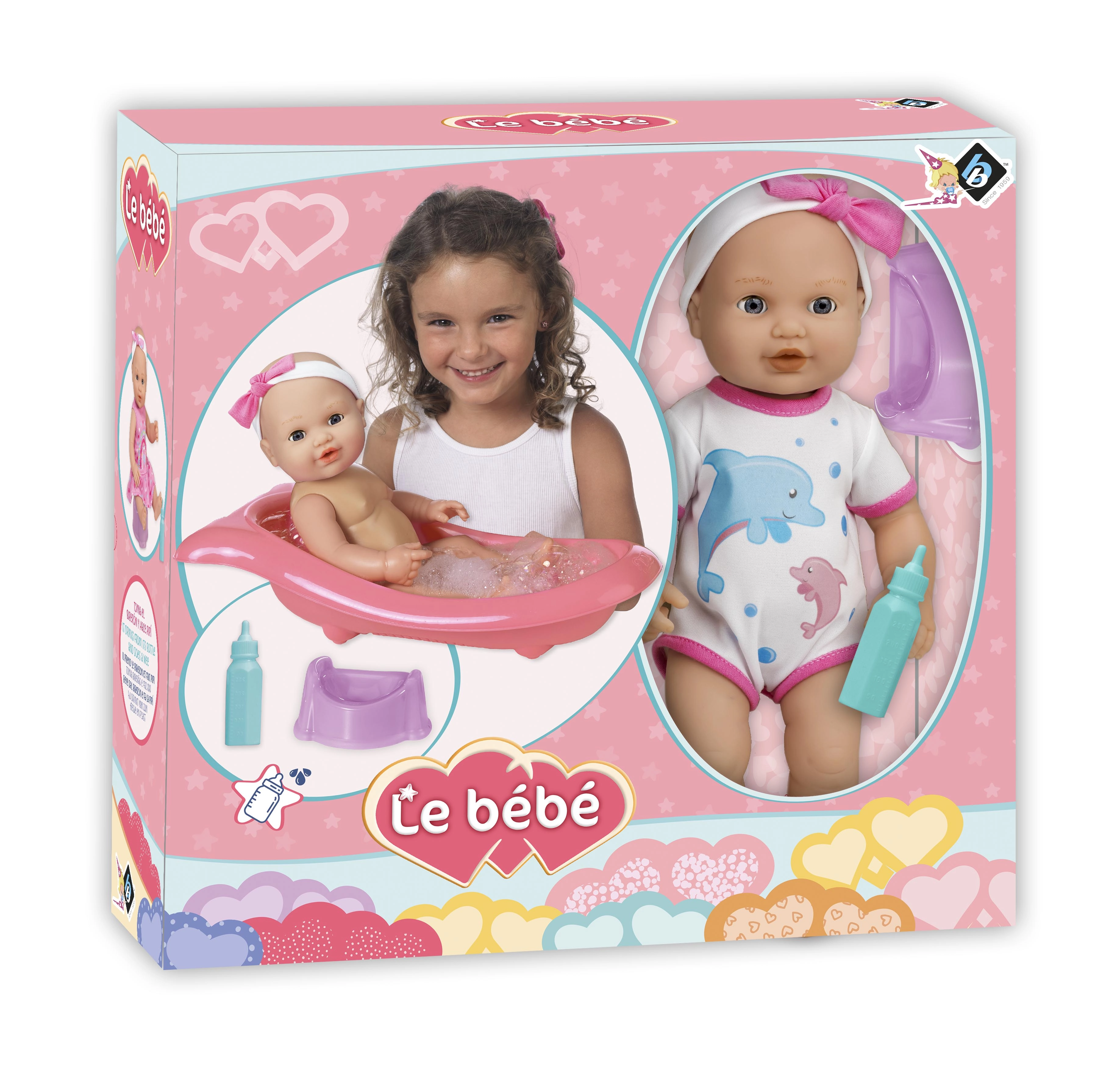 • Accessoires complets – petite baignoire, biberon et pot réunis dans un seul set.