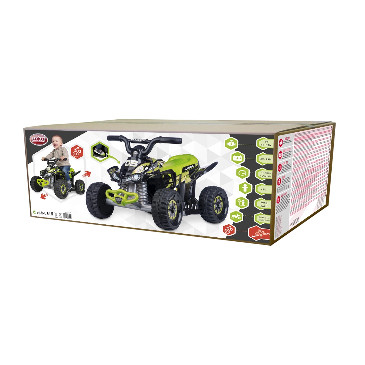 La batterie 7,4 V (15–18 W, 3 Ah) assure une propulsion fluide avec une vitesse maximale de 2,4 km/h – un rythme idéal pour l’apprentissage et le jeu en toute sécurité. La construction solide avec une capacité de charge jusqu’à 30 kg fait de ce quad un compagnon fiable, aussi bien dans la cour qu’au parc.