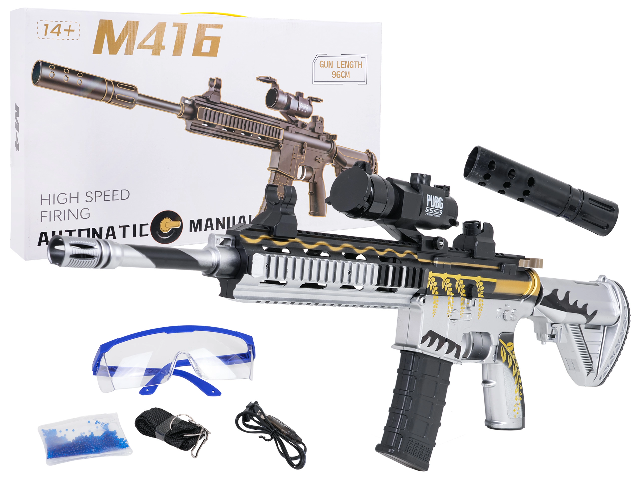 - Pistolet gel M416, chargeur, silencieux, viseur, câble USB, batterie 7,4 V, sachet de billes à préparer (env. 500 pcs), sangle, lunettes de protection, notice