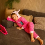 Les poignets et chevilles côtelés maintiennent la coupe en place, pour que la combinaison ne gêne pas pendant le jeu. Le tissu polaire doux est délicat pour la peau, chaud et en même temps respirant – idéal à la maison, pour les photos, les fêtes ou comme costume de carnaval.
