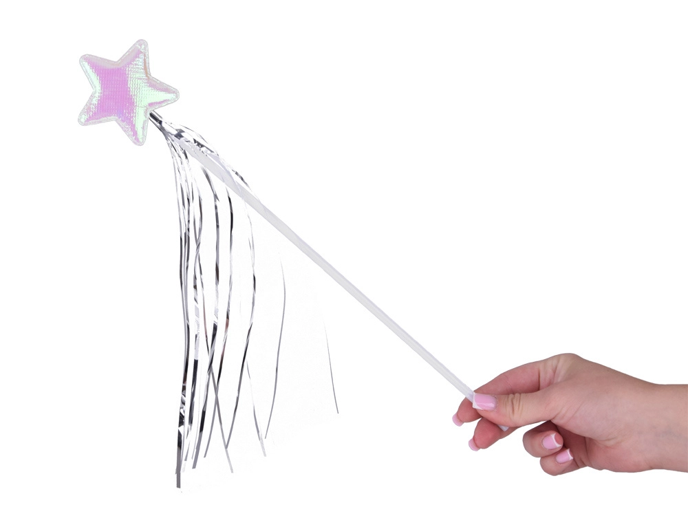 L’auréole douce et duveteuse sur serre-tête complète le look céleste. La baguette avec étoile scintillante et franges argentées stimule l’imagination lors des jeux et représentations.