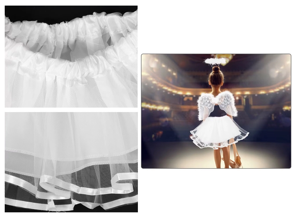 La jupe en tulle multicouche est légère et aérienne. La taille élastique s’adapte facilement – environ 18–30 cm de tour, longueur de jupe env. 32 cm. Parfaite pour une liberté de mouvement et un confort toute la journée.