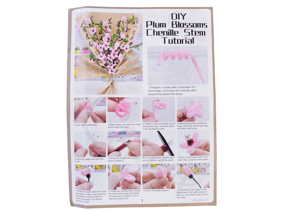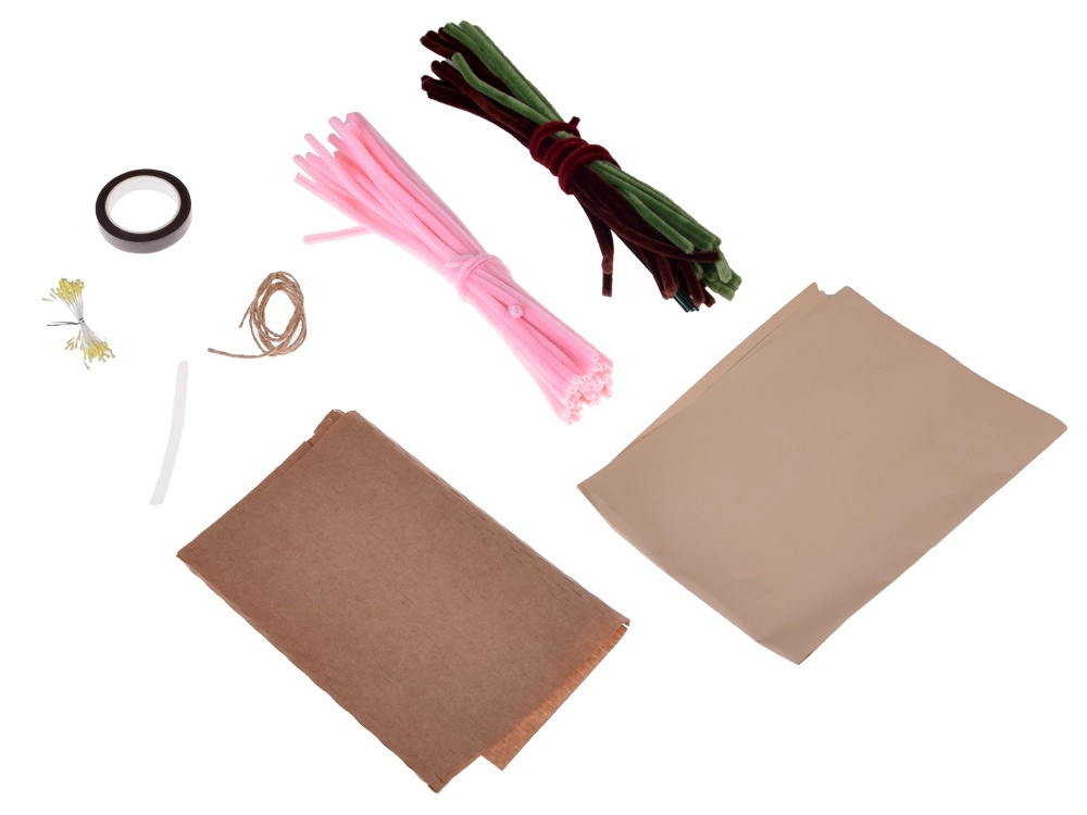 Le kit comprend des matériaux de couleurs variées, des papiers pour emballer le bouquet, de la ficelle et du ruban. Un guide illustré est inclus – il suffit d’ouvrir et de créer.