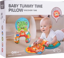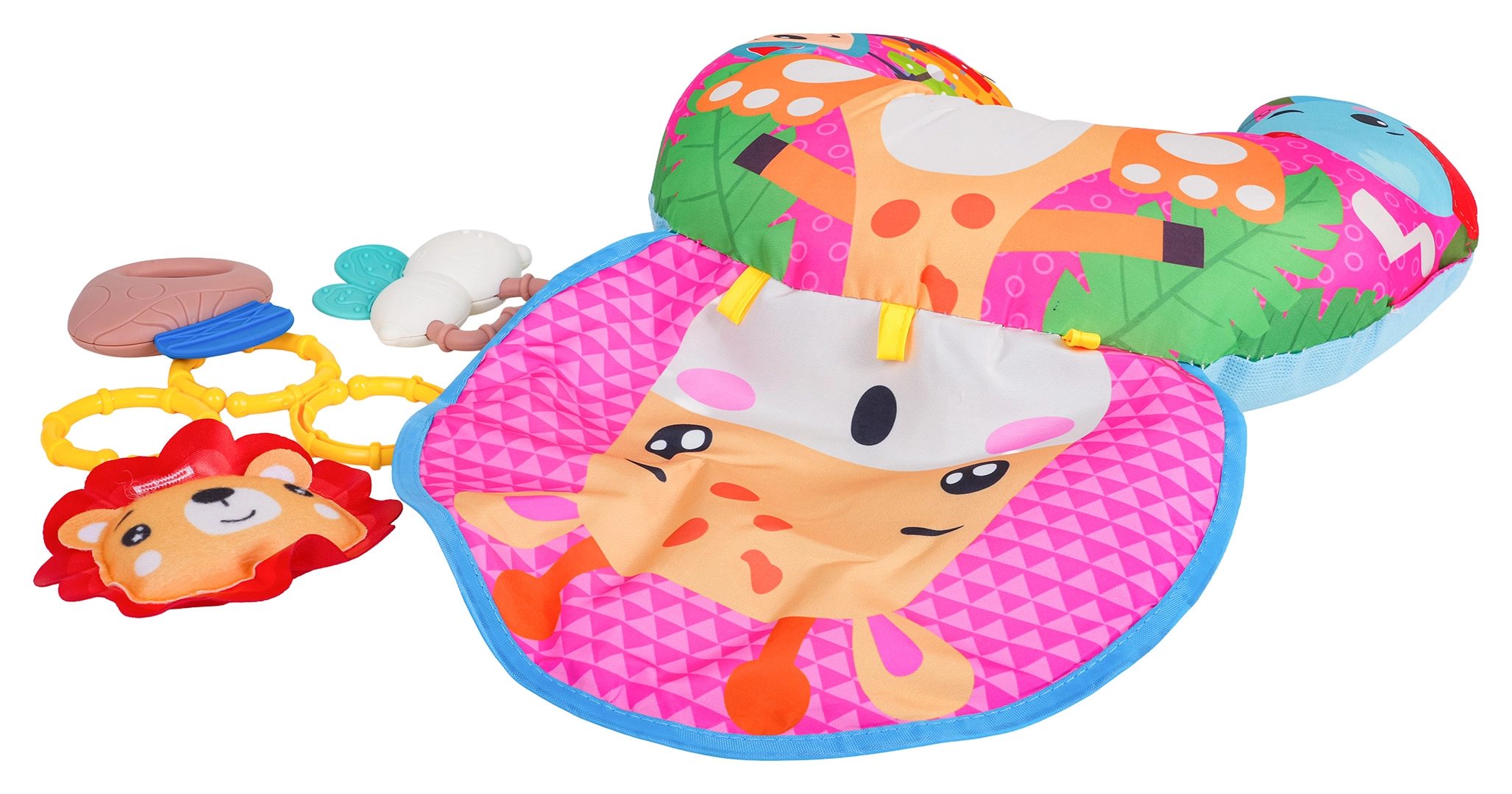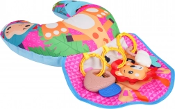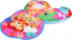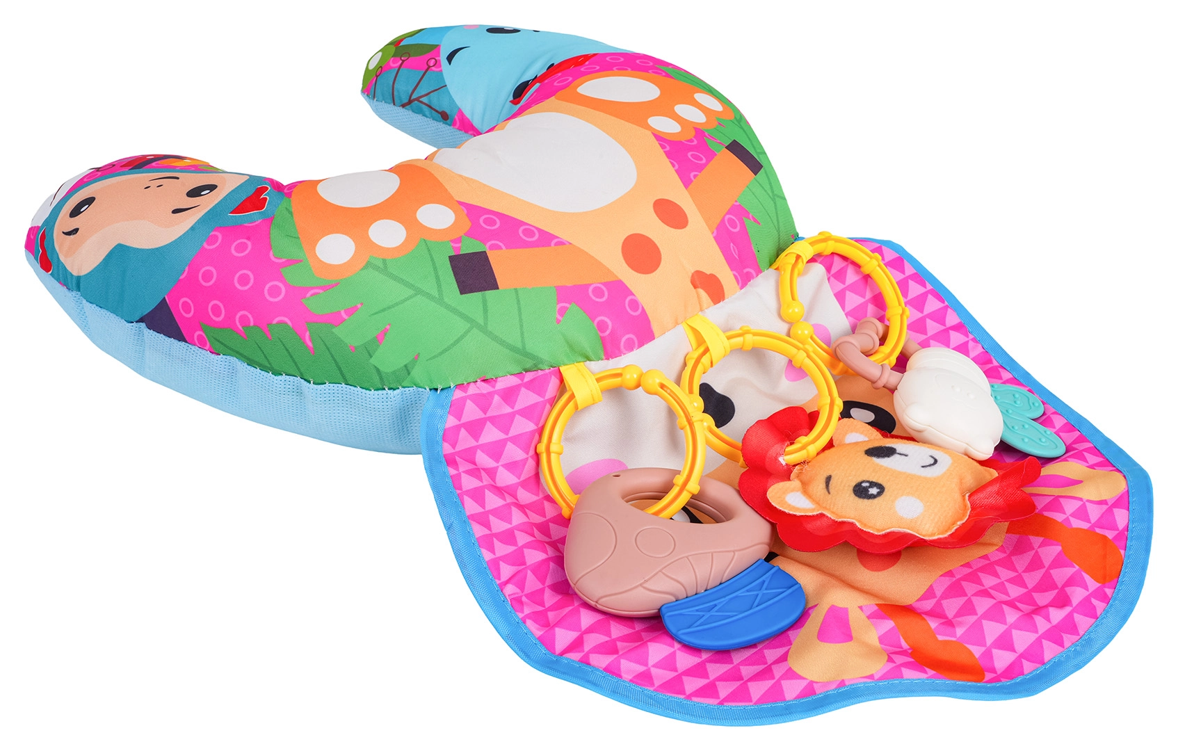 Coussin pour bébé doux et coloré en forme de U avec motif girafe, soutient le bébé lors du temps sur le ventre et en position assise. Il comprend des jouets suspendus amovibles avec anneaux de dentition, hochets et pouet, qui développent les sens et la motricité. Convient dès les premiers jours de vie, fabriqué avec des matériaux sûrs.