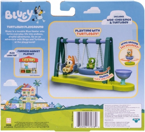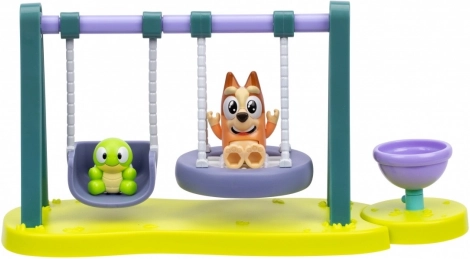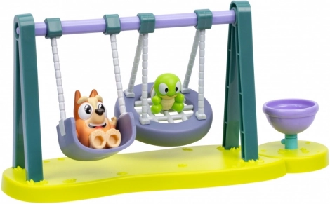 Ce mini set de jeu avec balançoires haut en couleur ravira tous les petits fans de BLUEY. Deux balançoires fonctionnelles et un plateau/toupie invitent à d'innombrables histoires au terrain de jeu. Les enfants peuvent asseoir Bingo et la petite tortue, les balancer d'avant en arrière puis les faire tourner jusqu'à en avoir la tête qui tourne de joie.