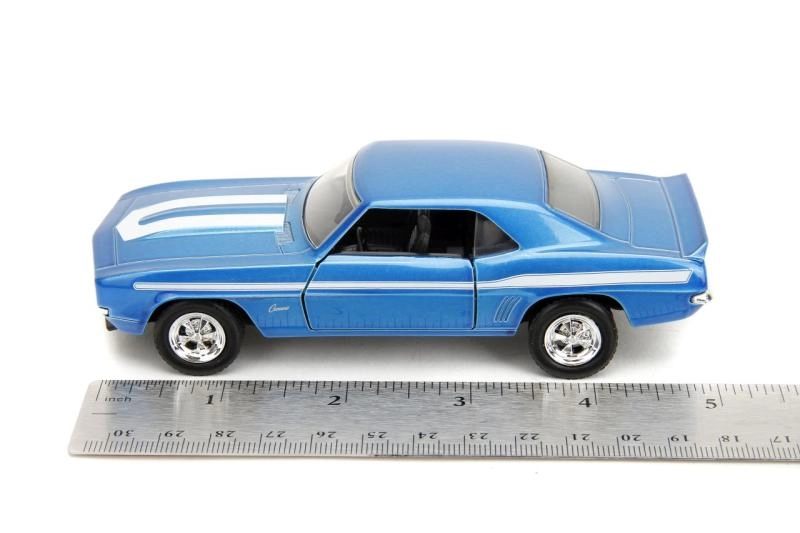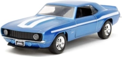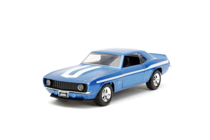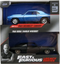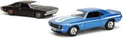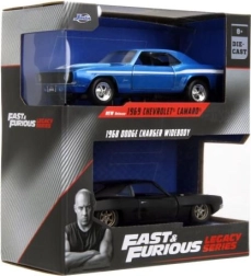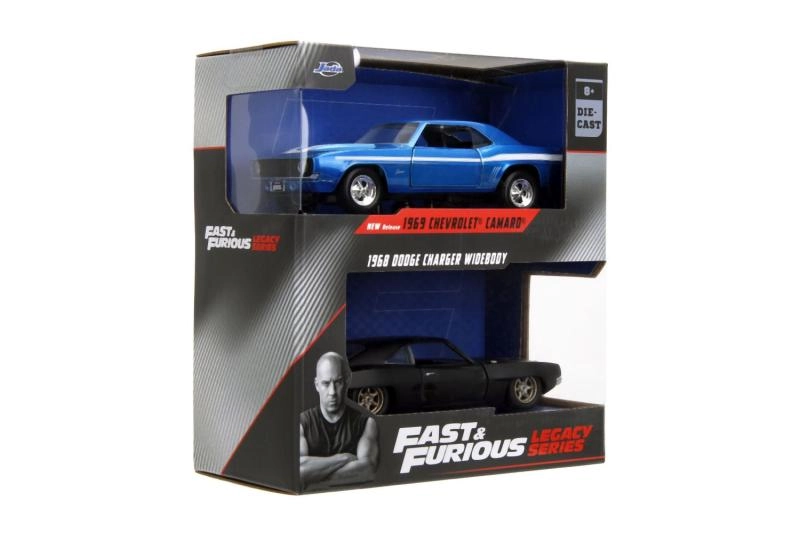 Ce coffret double stylé réunit deux muscle cars classiques en qualité de collection : Chevrolet Camaro 1969 bleue avec bandes blanches et Dodge Charger Wide Body 1968 noire mate. Des proportions réalistes, des lignes de carrosserie nettes et des vitrages transparents renforcent l’atmosphère cinématographique de la saga Fast & Furious.