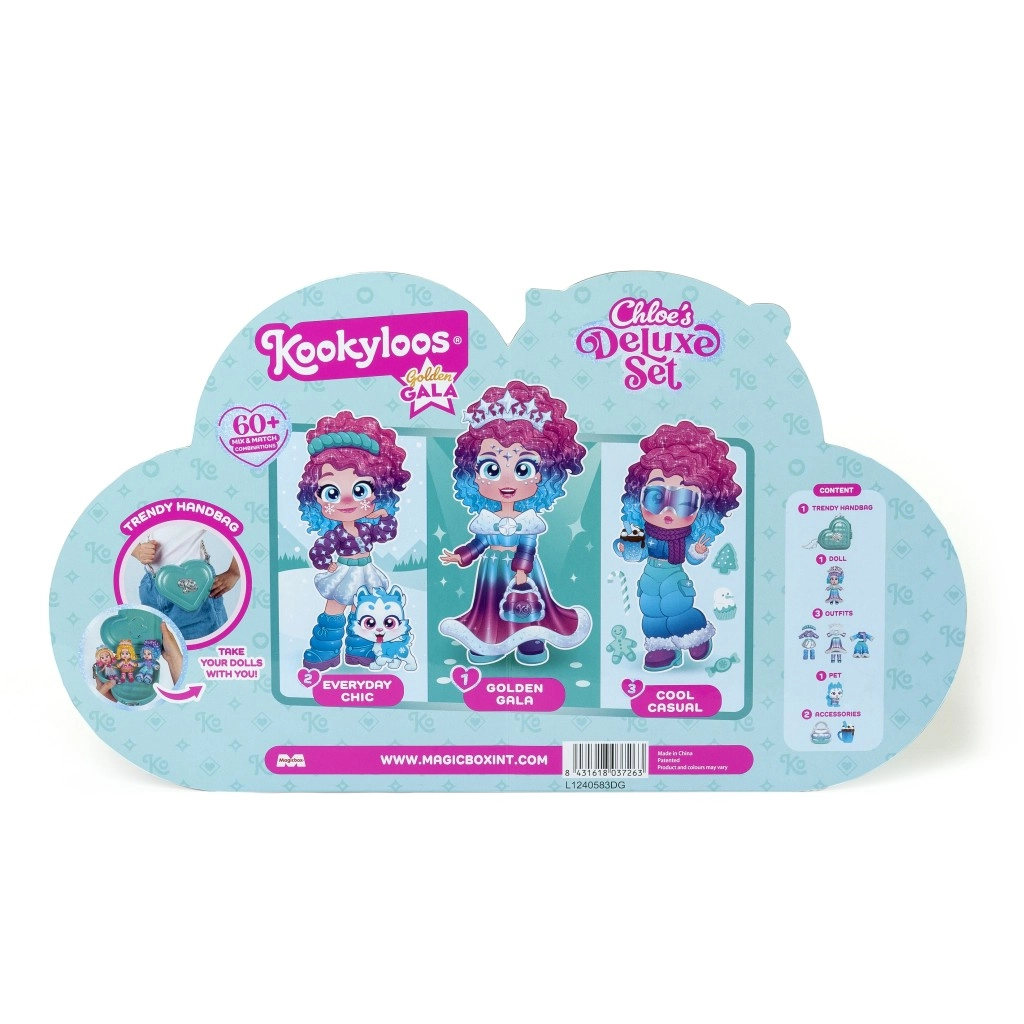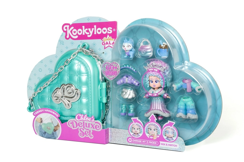 Découvre le style et l’amusement avec la KookyLoos Chloe dans le luxueux coffret Golden Gala Deluxe. T’attendent 3 tenues mix & match, des expressions de visage interchangeables en un clic, un adorable animal de compagnie et un sac en forme de cœur élégant pour voyager. Parfait pour créer, jouer et collectionner.