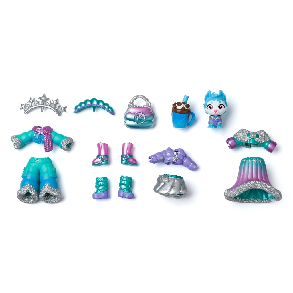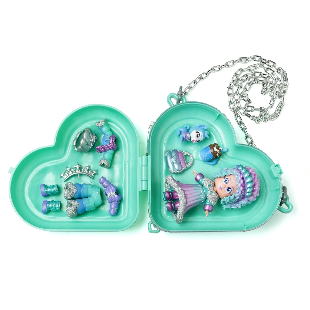 - 1 poupée Chloe, 3 tenues, 2 paires de chaussures, 2 tiares, collation, animal de compagnie, sac en forme de cœur