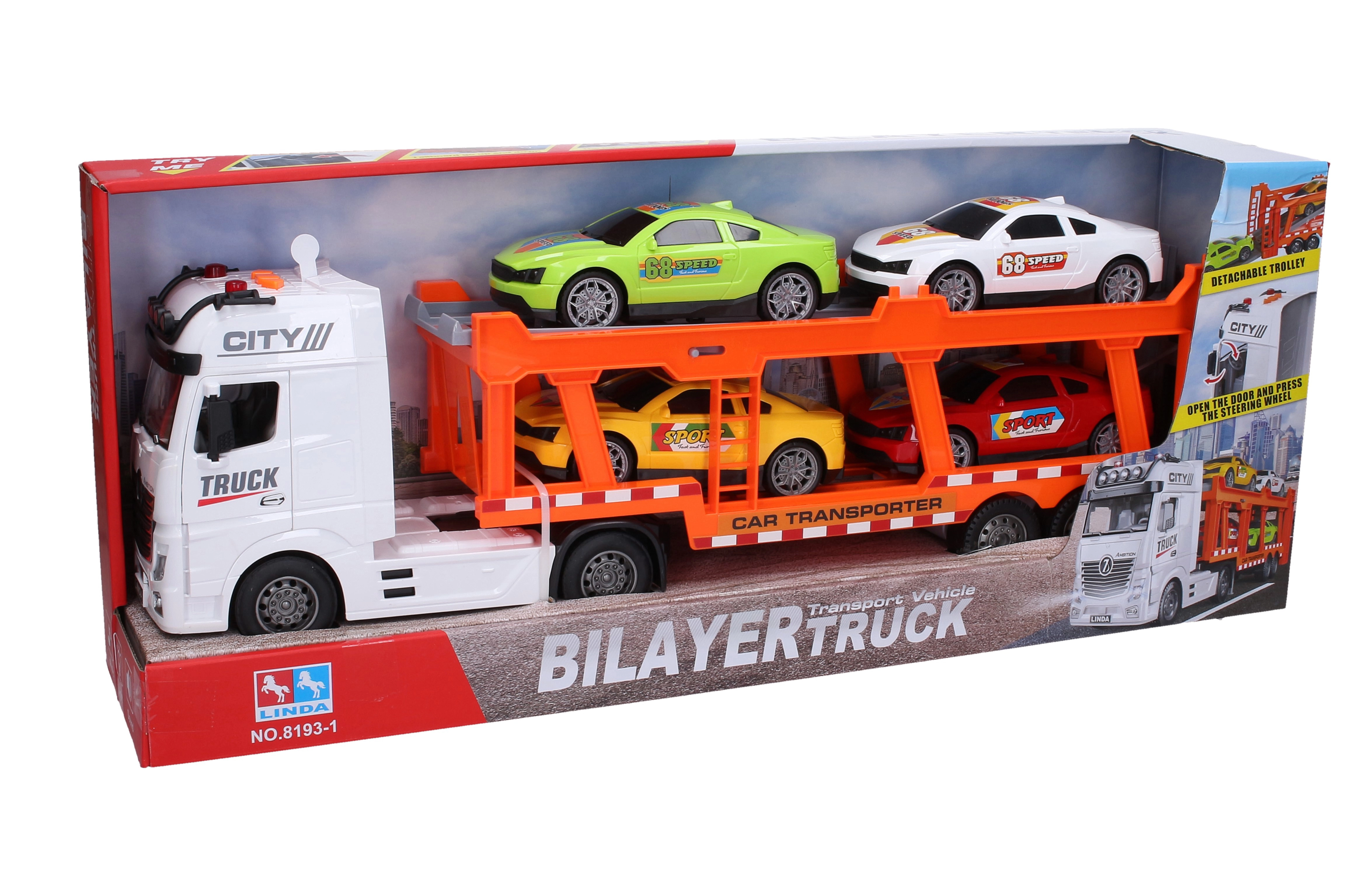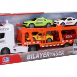 Grand camion porte-voitures à inertie 56 cm avec 4 voitures, effets lumineux et sonores