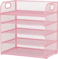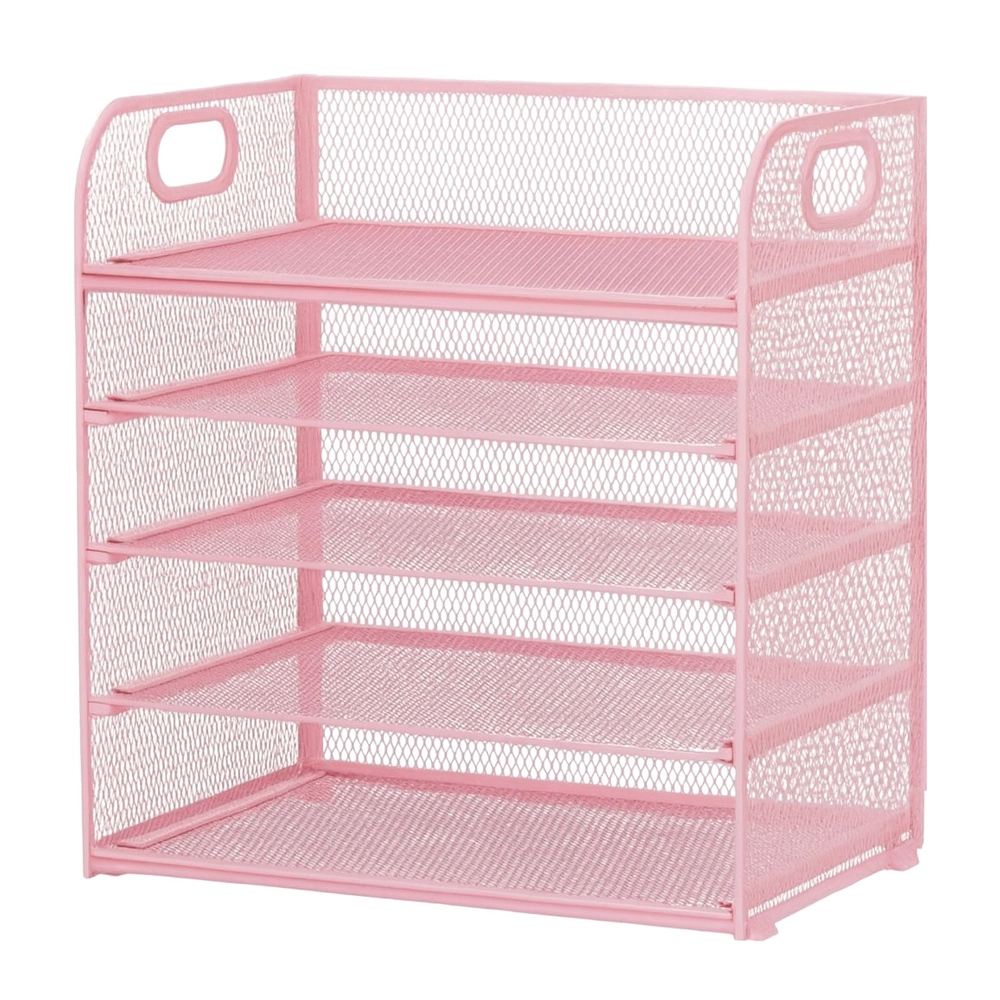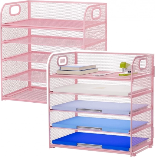Un élégant organiseur de bureau rose avec 5 niveaux spacieux aide à garder les documents, cahiers et accessoires de bureau en ordre. Maille métallique résistante avec revêtement par poudre, poignées latérales pour un transport facile et structure stable en font un choix idéal pour le bureau, le télétravail et la chambre d’étudiant.