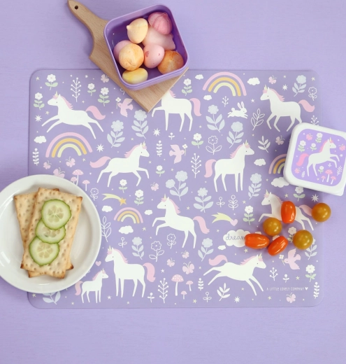 Ses dimensions généreuses offrent suffisamment d’espace pour l’assiette, les couverts et le verre. Le violet pastel avec motif de licornes et d’arc‑en‑ciel illumine la table des enfants et renforce une ambiance joyeuse à l’heure du repas.