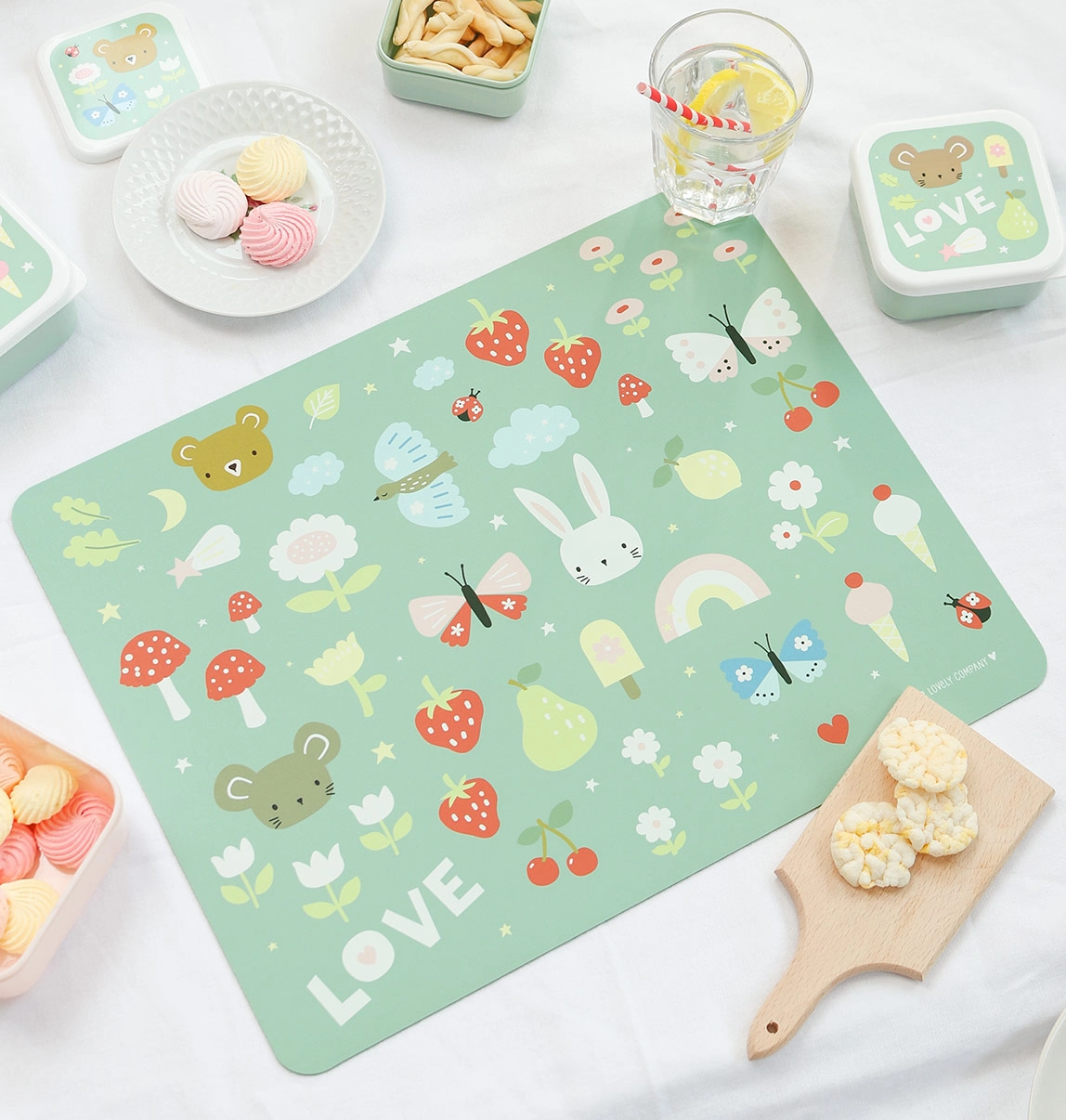 Ce set de table pour enfants, d’un vert intense avec un motif ludique, convient à toutes les tables. Grâce au vinyle résistant, il se nettoie facilement, conserve son bel aspect dans le temps et protège la surface de la table lors d’un usage quotidien.