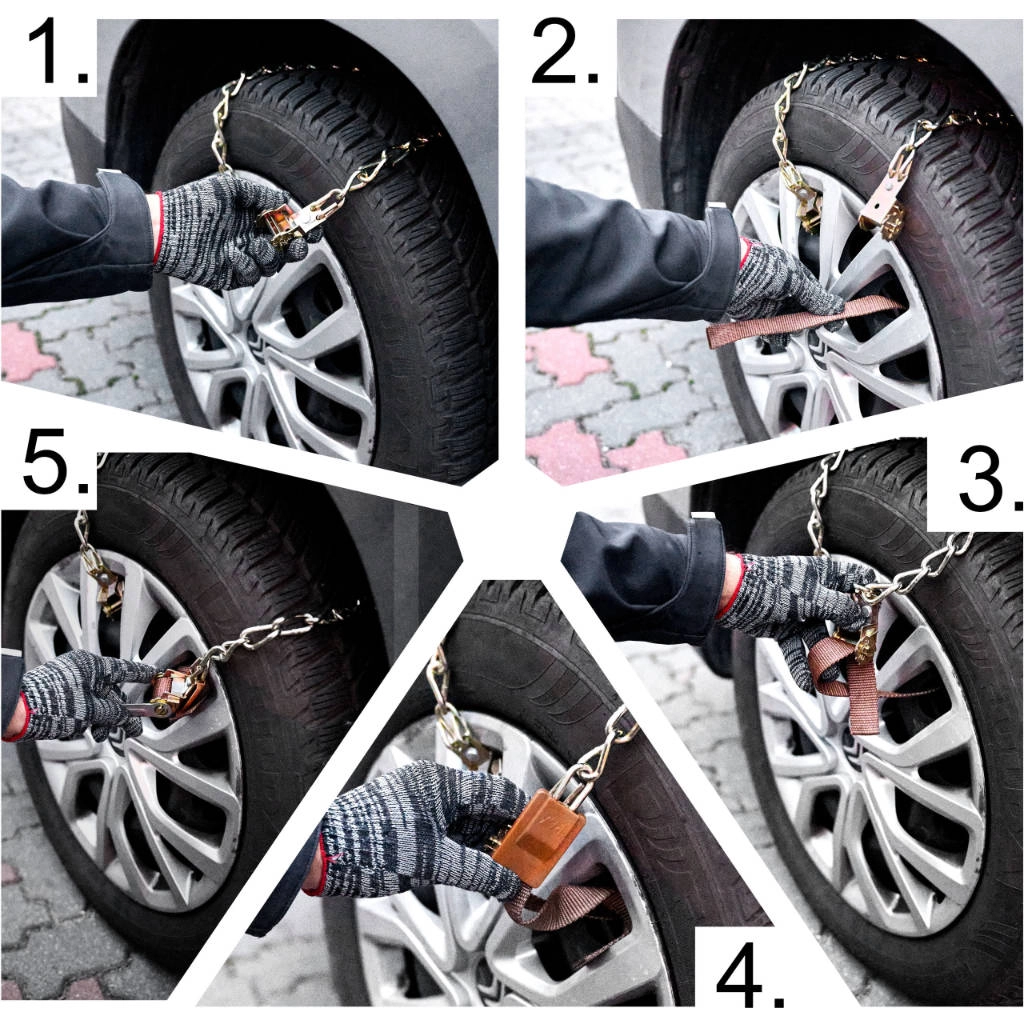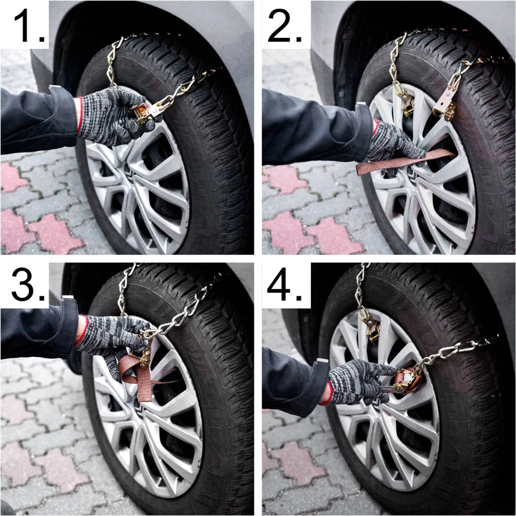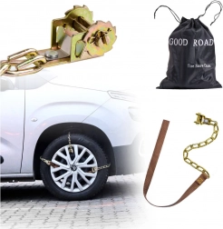 Longueur réglable pour une largeur de pneus d’environ 16,5–26,5 cm, assurant la compatibilité avec de nombreux véhicules.