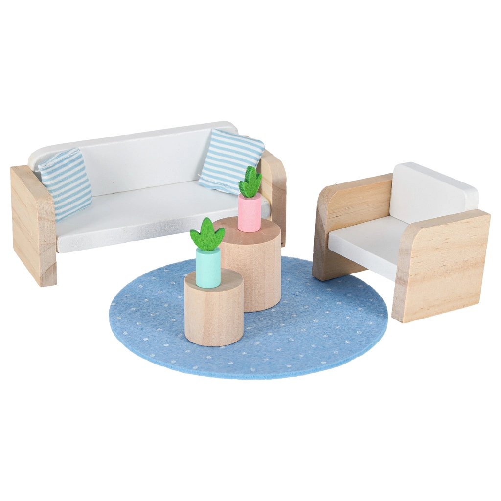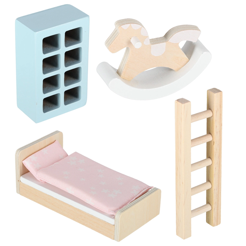 - Set de 25 pièces de mobilier : lit avec linge de lit, canapé et fauteuil, tables et tabourets, étagères, évier de cuisine, commode, décorations, petit tapis et cheval à bascule.
