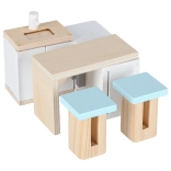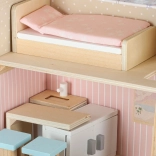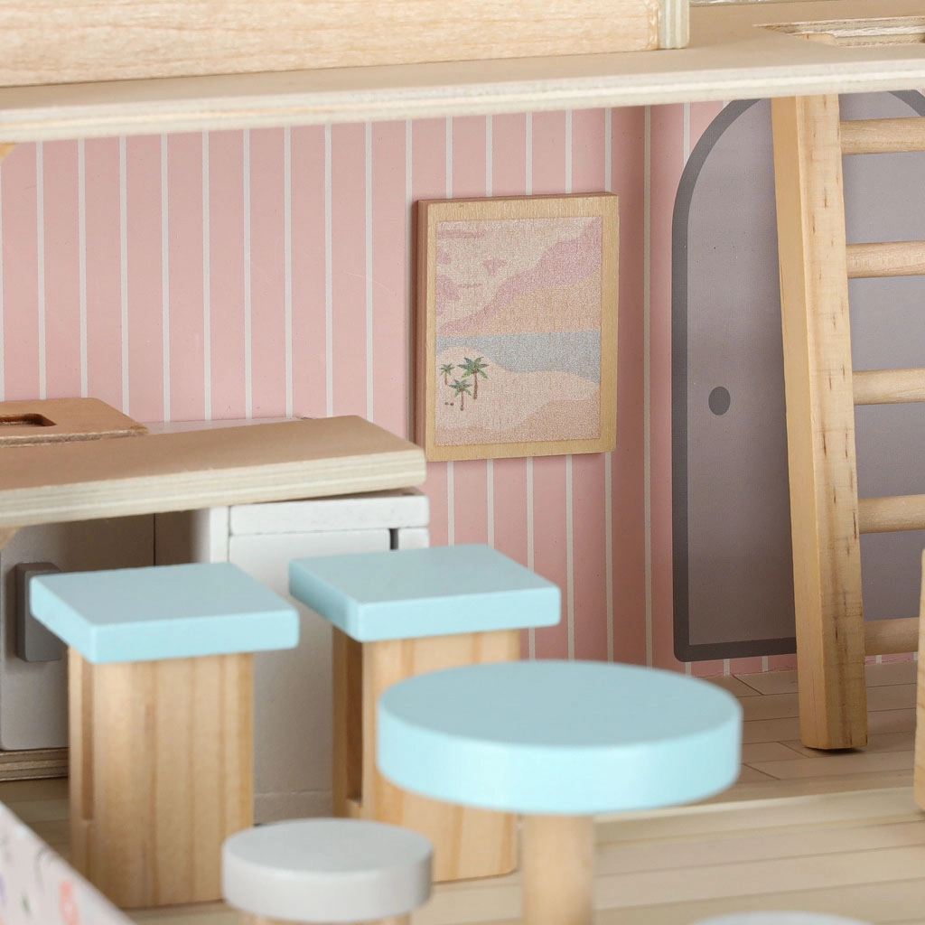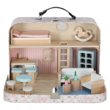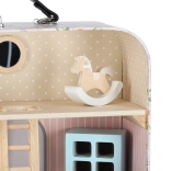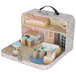 Cette mini maison de poupée dans une valisette se transforme, une fois ouverte, en intérieur à deux étages avec cuisine, salon et chambre. Les couleurs pastel associées au bois naturel créent une atmosphère chaleureuse et invitent au jeu d’imitation avec des poupées ou des figurines.