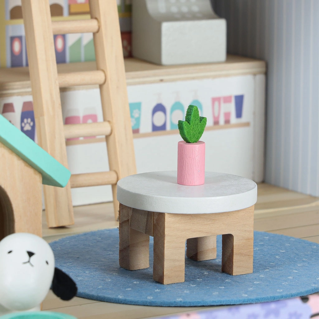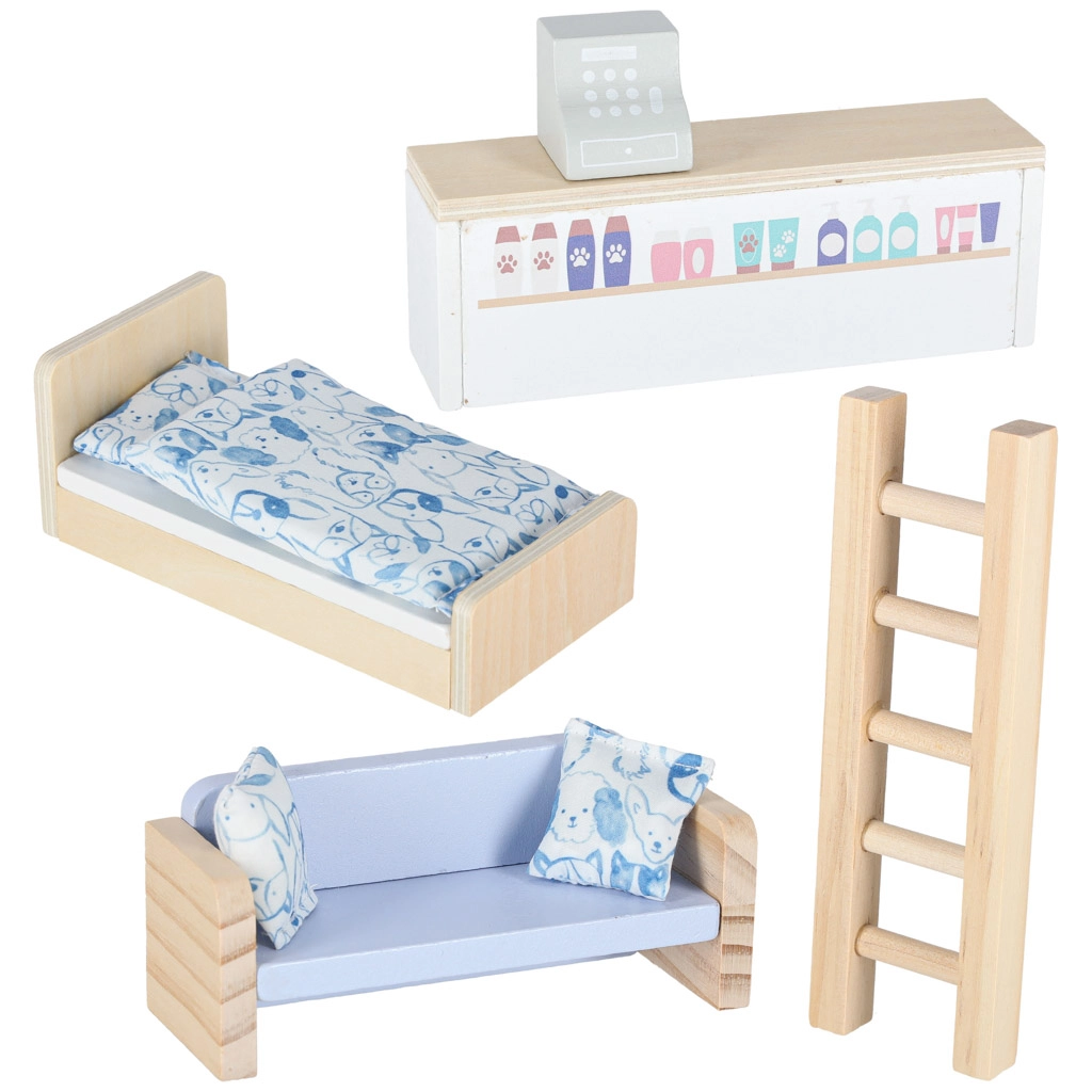 Le set comprend un mobilier en bois de qualité (lit avec literie, canapé, table, étagères, échelle), des éléments de boutique (comptoir et caisse) ainsi qu’un coin pour animaux avec niche pour chien, griffoir pour chat et deux gamelles. Grâce au design valisette, emportez facilement le jouet en visite, en vacances ou au terrain de jeu – et rangez tout rapidement après le jeu.