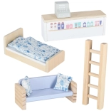 Un lit avec couettes, un canapé, une table, des étagères, une échelle et des éléments de boutique offrent de nombreuses possibilités de jeu créatif.