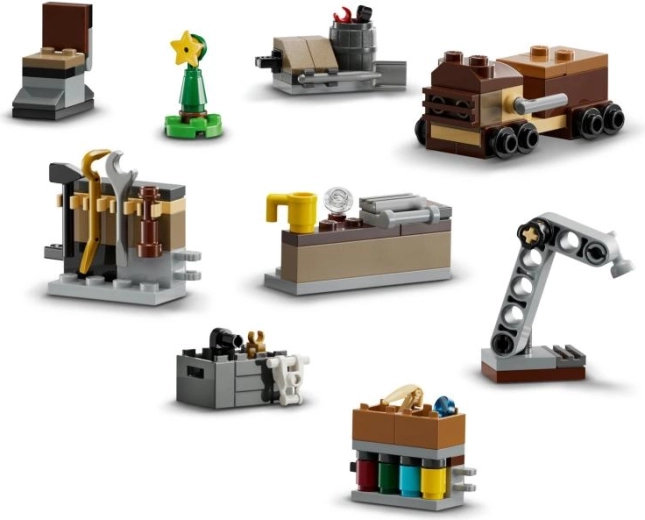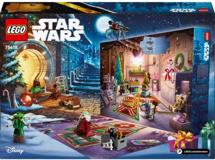Le set propose un mélange varié : minifigurines C-3PO, Jawa (édition festive) et Babu Frik, cinq figurines de droïdes autonomes et huit droïdes à construire à exposer et à jouer. Inclus également des mini modèles d’atelier, un chariot et une grue des Jawas connectables, une boîte avec pièces de rechange et un sapin de Noël stylé.