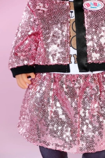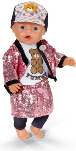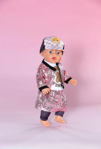 Apportez à votre poupée ou à votre BABY born Teddy un style unique avec cet ensemble pailleté pour taille 43 cm. Le set comprend une veste à sequins rose, une jupe, un t-shirt imprimé ourson, un bonnet et un legging – idéal pour un jeu créatif et durable. Inclus également, un cintre en matériau recyclé pour un jeu plus durable.