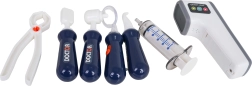 Stéthoscope, thermomètre, seringue, pince, ciseaux, instruments dentaires, cartes « radiographie », modèle de dents, fiche patient et autres accessoires.