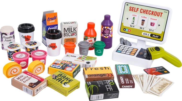 La caisse réagit par des sons à l’appui des boutons et permet de simuler un paiement par carte. Les enfants peuvent scanner les produits, additionner les achats et ressentir la vraie expérience de la caisse.