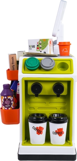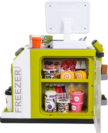 Le set est fabriqué en plastique de qualité, durable et aux couleurs vives. Inclus : une machine à café avec capsules et gobelets, de nombreux emballages d’« aliments » et des compartiments pratiques pour un rangement ordonné. Le scanner dispose d’effets lumineux et sonores, la caisse émet des sons à l’appui des boutons et lors du paiement par carte.