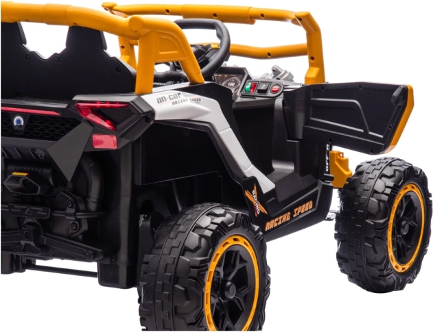 Robuste voiture électrique pour enfants 4x4 en jaune attractif pour deux enfants, offrant une conduite aventureuse tout-terrain, de grandes roues profilées, des phares réalistes et une construction durable pour un amusement en plein air en toute sécurité.