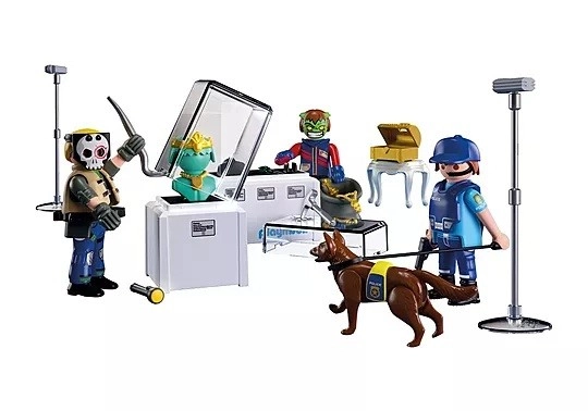 Alarme au musée – des voleurs essaient de forcer les vitrines et de s’enfuir avec le butin ! Le policier se faufile discrètement dans la salle d’exposition et, avec le chien de service, lance la poursuite. Le set PLAYMOBIL Action Heroes propose une histoire dynamique avec de nombreux accessoires et fonctions réalistes qui plongent les enfants dans l’univers des grands braquages.