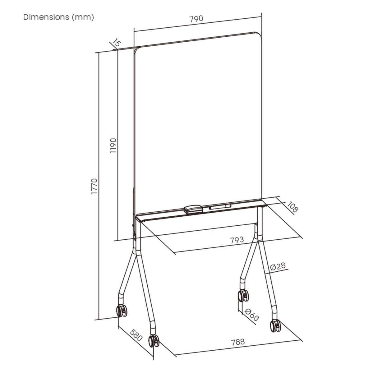 Le format 119 × 79 cm en orientation verticale offre suffisamment d’espace pour notes, croquis et tâches, tout en occupant peu de place dans la pièce. La tablette porte-accessoires intégrée garde marqueurs et effaceur toujours à portée.