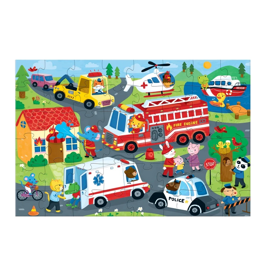 Découvrez un puzzle de sol ludique et éducatif sur le thème des véhicules de secours. Il comprend 48 grandes pièces, idéales pour les petites mains, fabriquées en papier recyclé avec des encres non toxiques et une finition mate pour des couleurs et des détails fidèles. Inclus également un visuel de référence et une boîte résistante en carton recyclé.