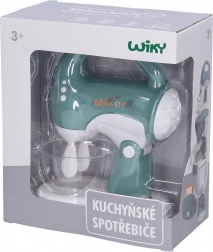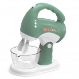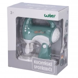 L’alimentation est assurée par 2× piles AA (non incluses). Les piles se placent sous le mixeur – pour y accéder, il faut d’abord déclipser le mixeur de son socle. Grâce à ses dimensions compactes 16 × 6 × 12 cm, il s’intègre facilement à tout set de jeu.