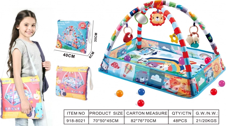 L’arche amovible est équipée de jouets variés : un miroir sécurisé, un champignon avec hochet et anneau de dentition, une abeille avec anneau de dentition et hochet, un anneau de dentition et un petit lion avec sifflet. Le tapis peut être facilement transformé en parc ou en piscine à balles sèche et complété par les balles fournies. L’ensemble est rangé dans un sac bandoulière coloré pour un transport aisé.