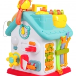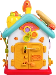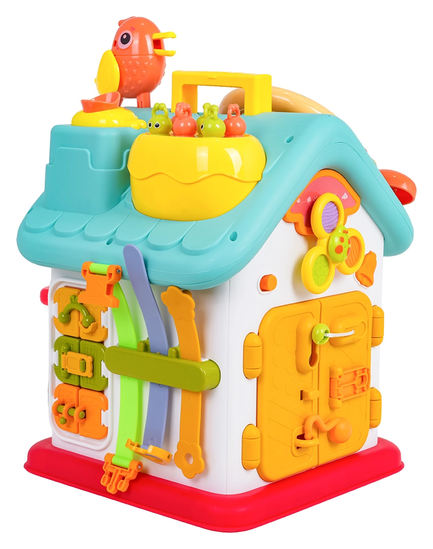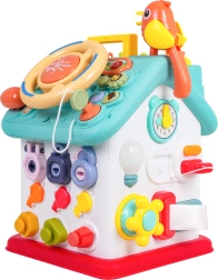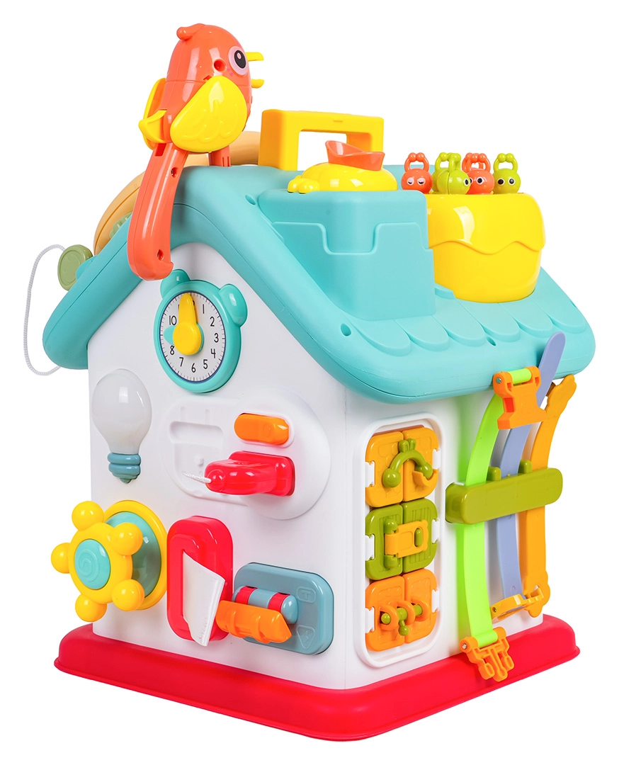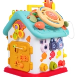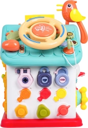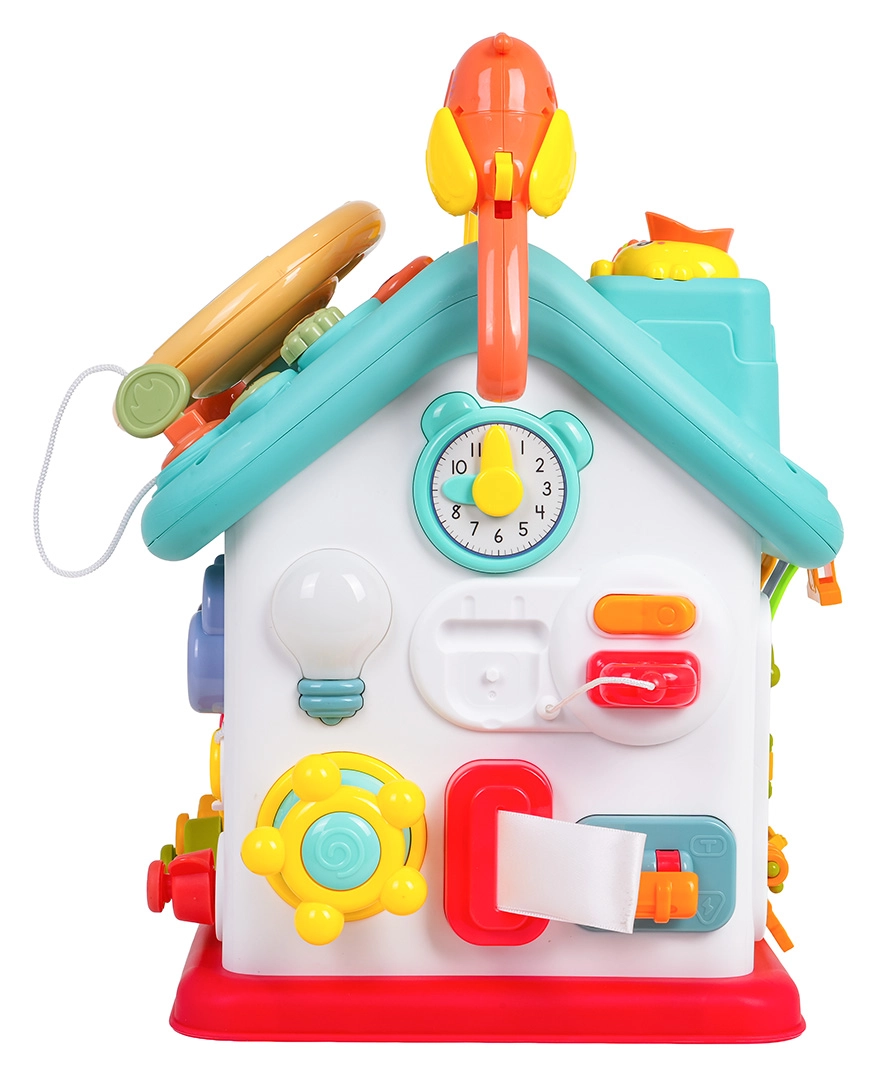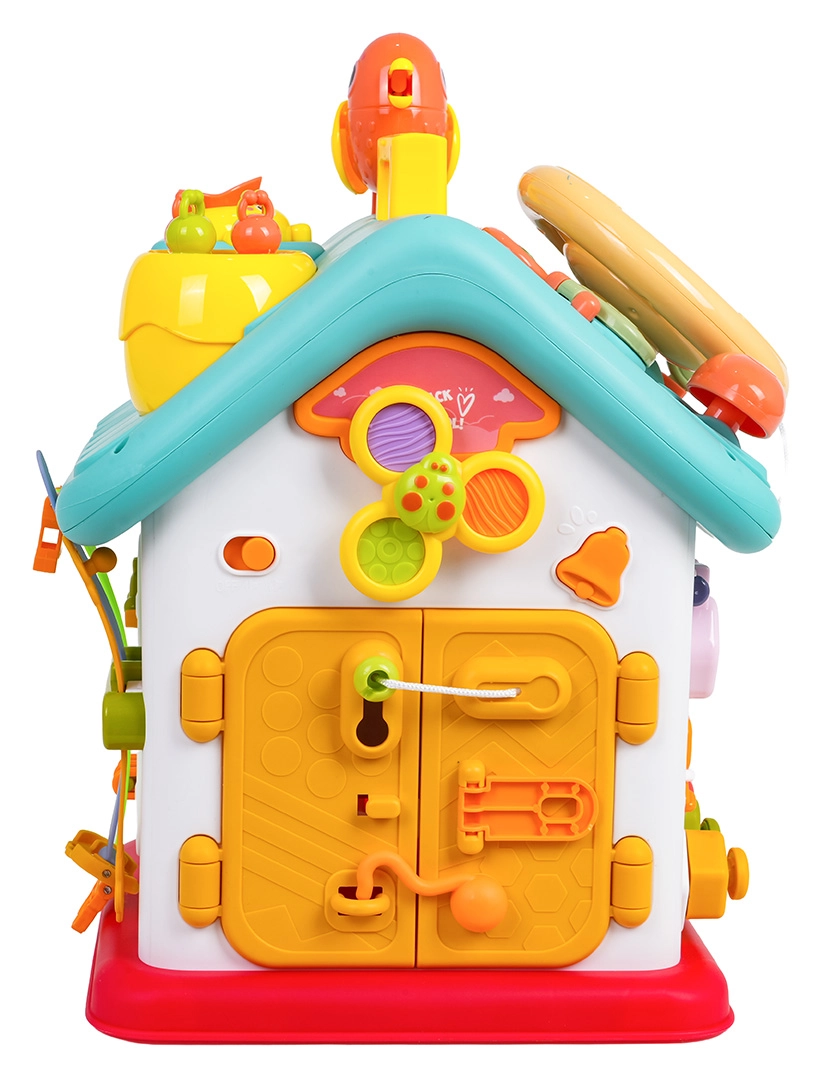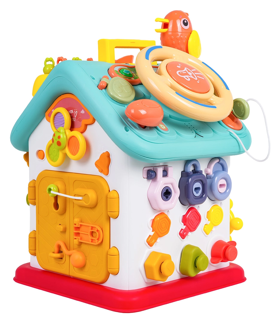 Cette maison interactive colorée offre de nombreuses activités sur toutes les faces et sur le toit : volant rétroéclairé avec klaxon, clignotants et démarreur à clé, ensemble de serrures et clés pour l’association, horloge à aiguilles mobiles, interrupteurs, engrenages et d’autres éléments manipulatoires. Les enfants exercent la coordination œil–main et comprennent le principe cause–effet.