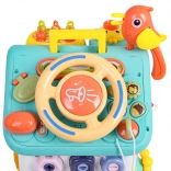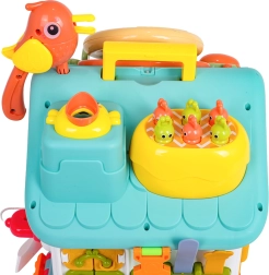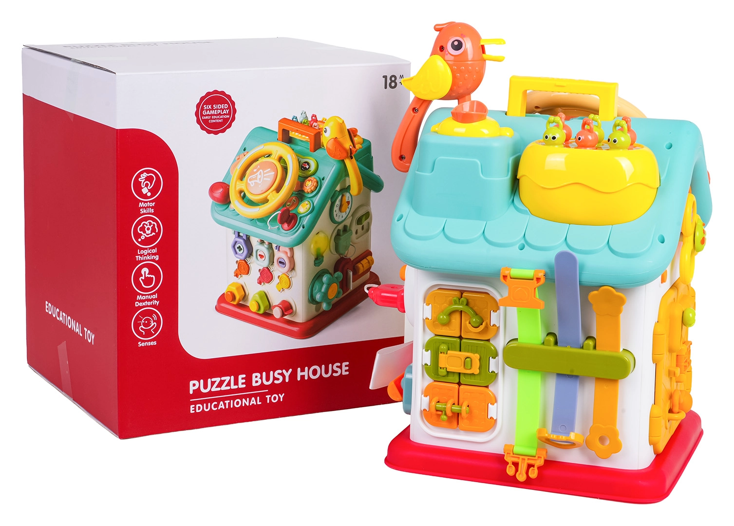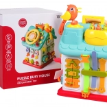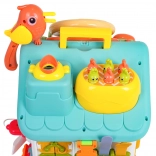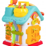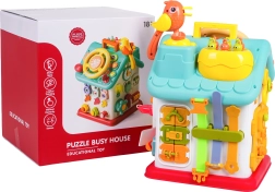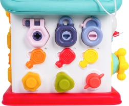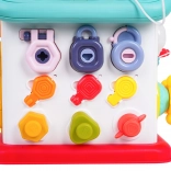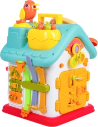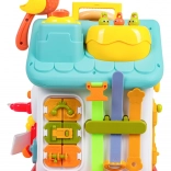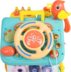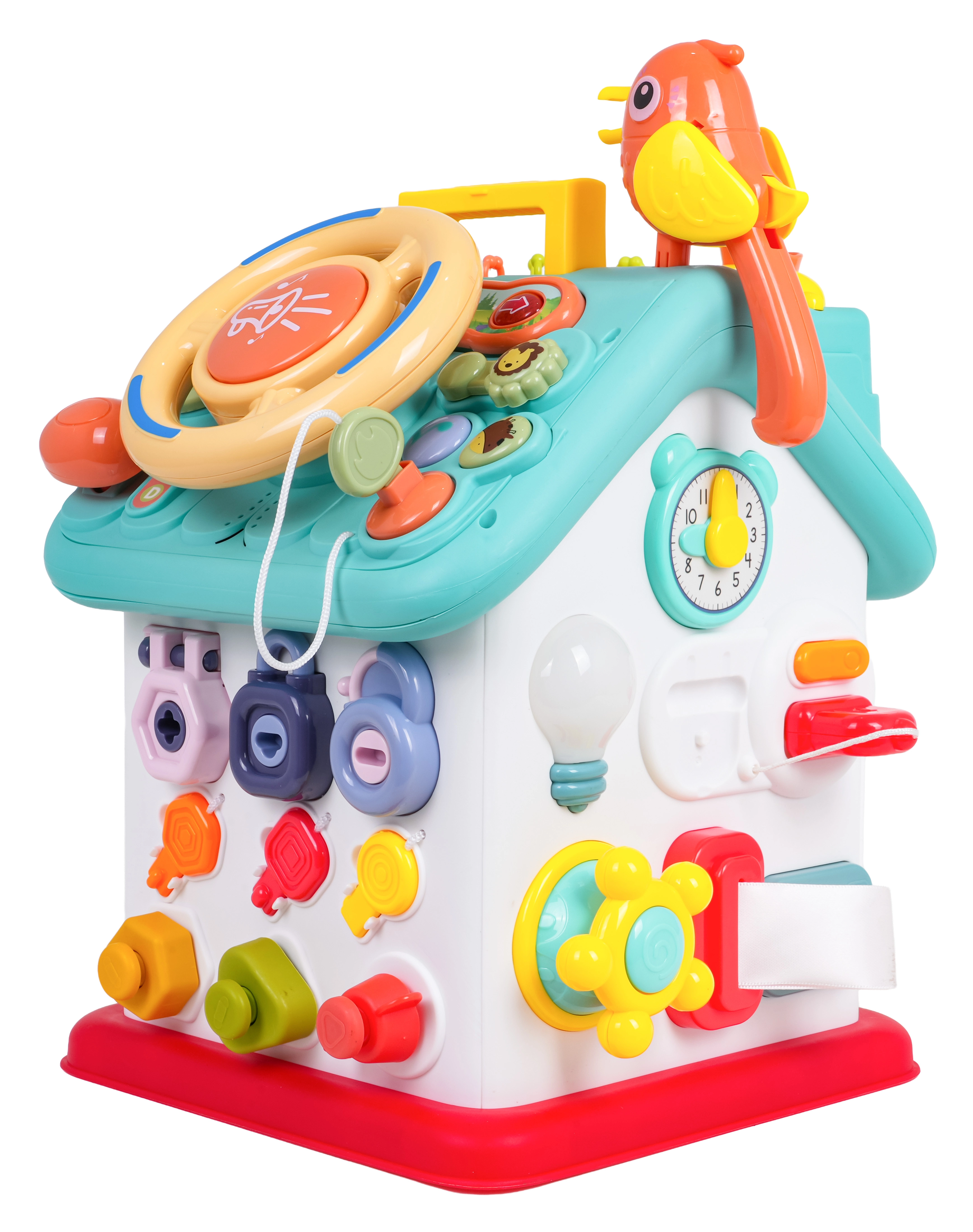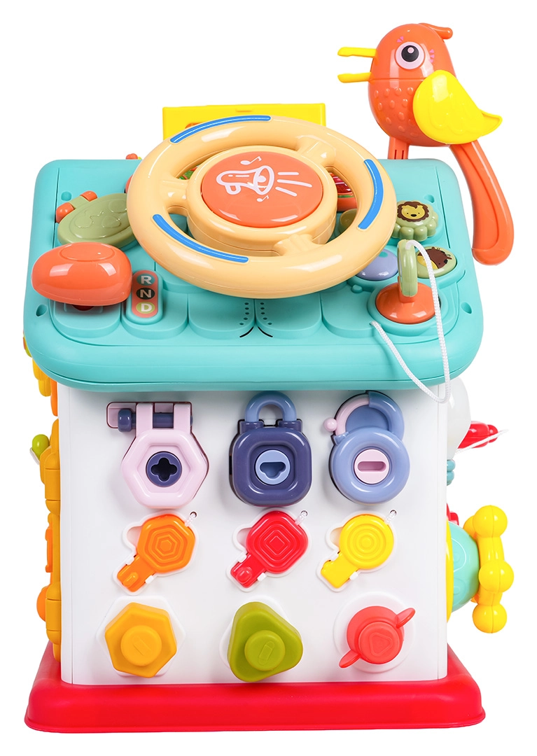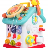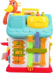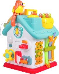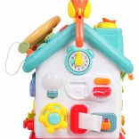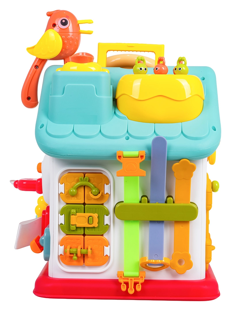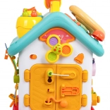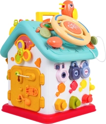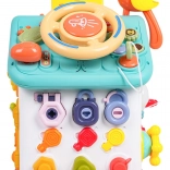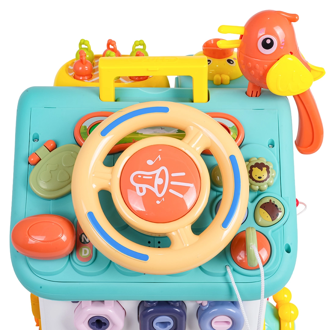 Cette maison interactive colorée offre de nombreuses activités sur toutes les faces et sur le toit : volant rétroéclairé avec klaxon, clignotants et démarreur à clé, ensemble de serrures et clés pour l’association, horloge à aiguilles mobiles, interrupteurs, engrenages et d’autres éléments manipulatoires. Les enfants exercent la coordination œil–main et comprennent le principe cause–effet.