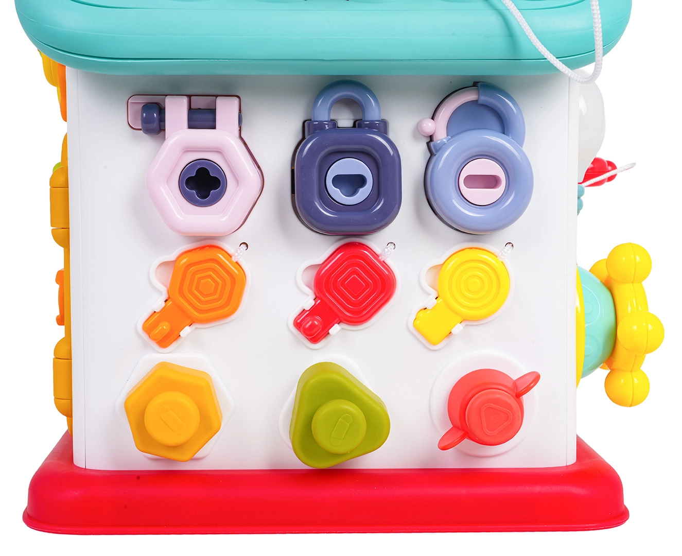 Trois clés colorées et trois serrures apprennent aux enfants à associer formes et couleurs. Les petites roues et poignées sous les serrures développent encore l’agilité des doigts et la coordination.