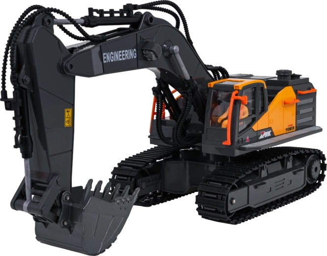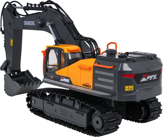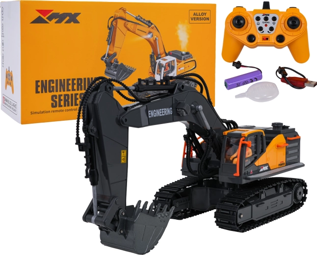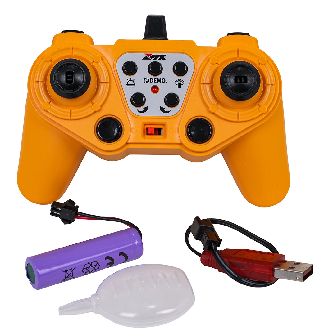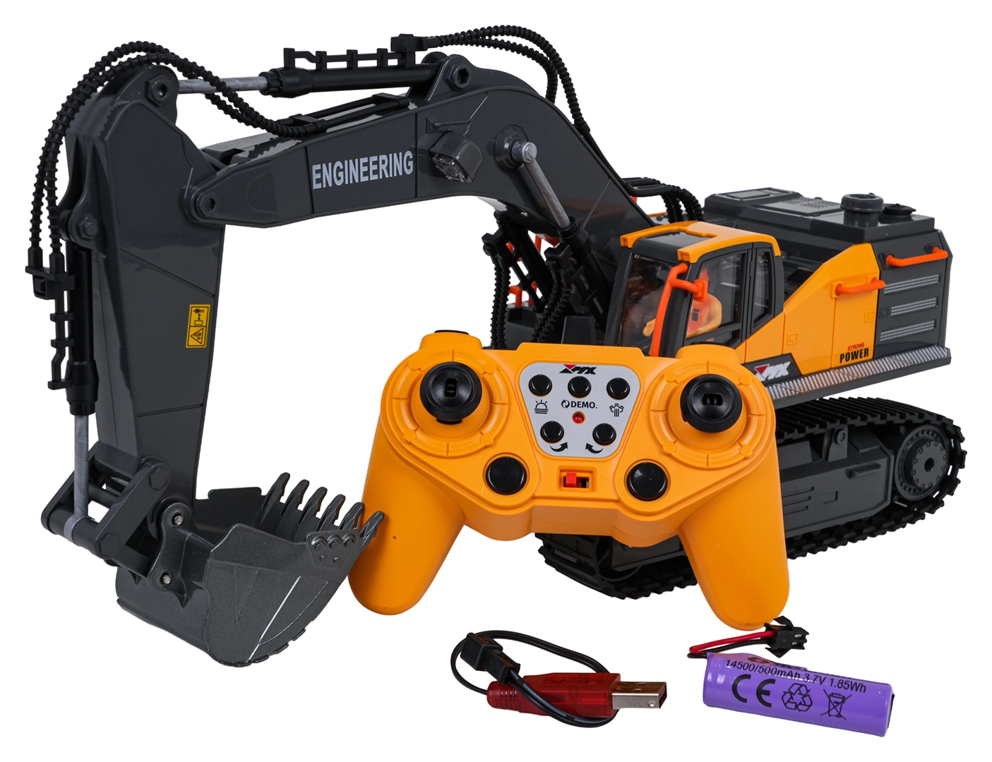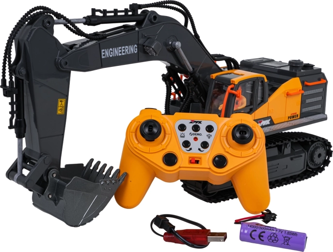 Le contrôle 2,4 GHz assure une portée stable sans interférences; la pelle avance, recule, tourne à droite et à gauche. Un mode démo, des sons de fonctionnement et de marche arrière sont disponibles, avec la possibilité de couper le son et les lumières. L’alimentation est assurée par la batterie rechargeable 3,7 V fournie; charge via USB.